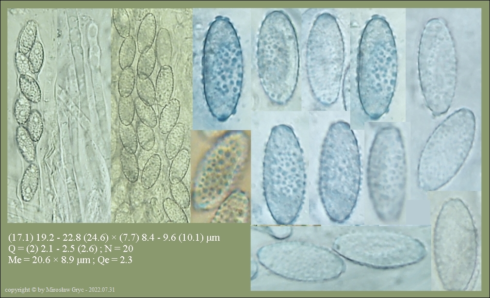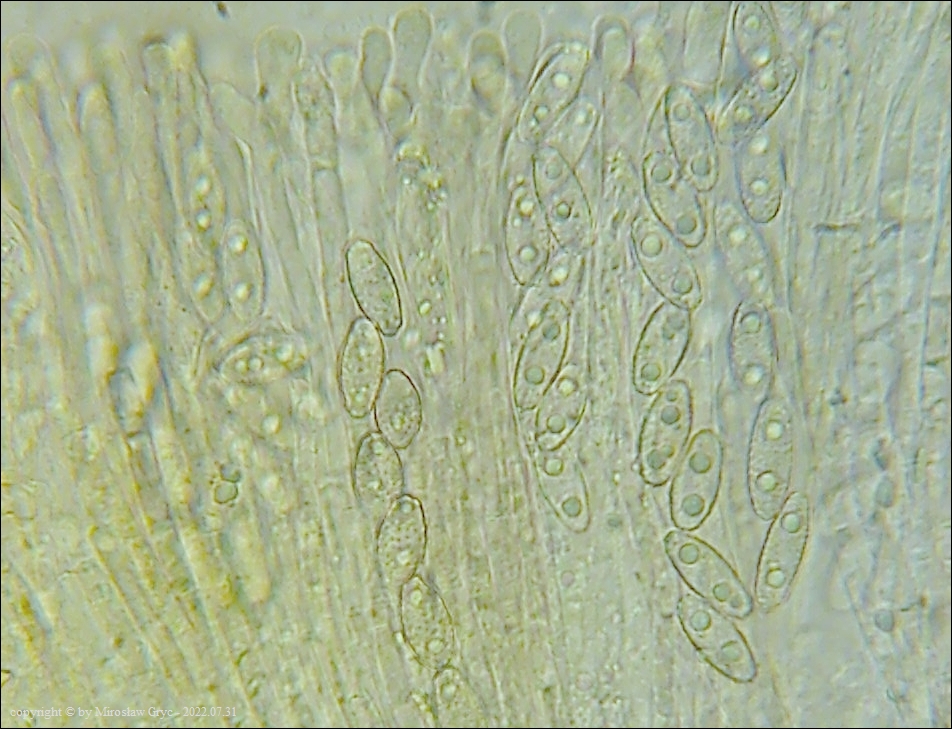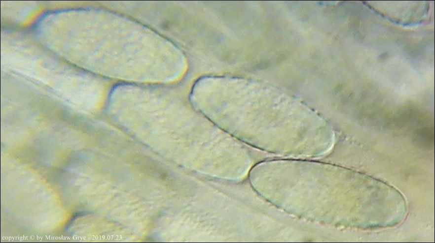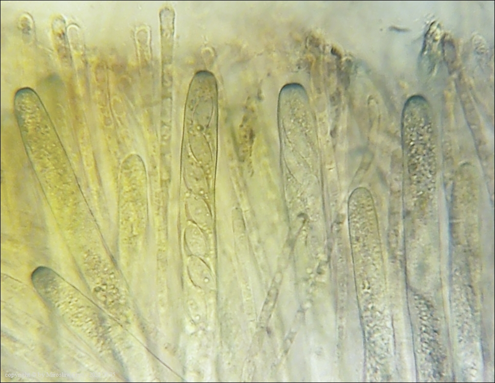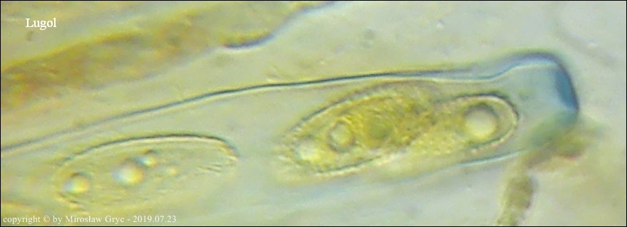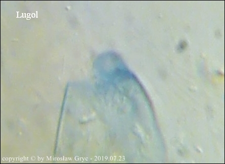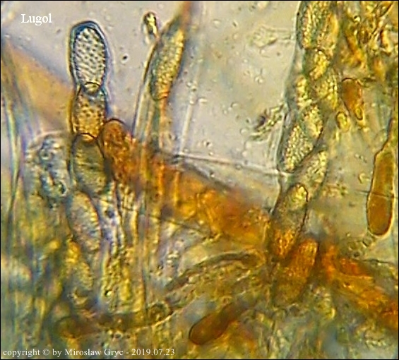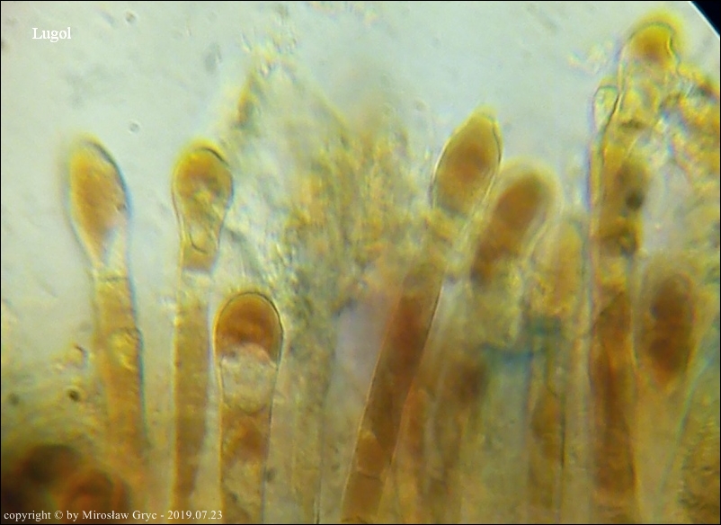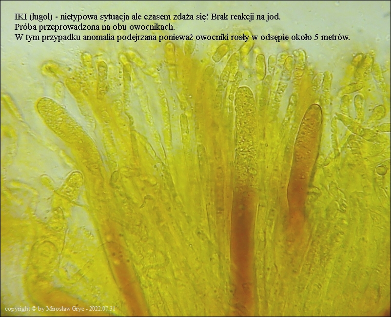 Kolekcja nieco nietypowa! Nie wystąpiła w żadnym owocniku, amyloidalna reakcja na jod. Nie są to przypadki odosobnione jednak zdażają się nader rzadko. Podejrzany jest fakt, że taka sytuacja zaistniała w obu owocnikach. Poza tym zawartość parafiz, a w zasadzie jej brak nie jest typowe dla tego gatunku. Zazwyczaj szczyty parafiz są wypełnione, mniej lub bardziej inensywnie zabarwioną na brązowo zawartością. Pomimo tych różnic pozostałe cechy wskazuja na ten gatunek. Cechy owocników pobranych z tego stanowiska później jak najbardziej pasowały do tego gatunku (patrz niżej).