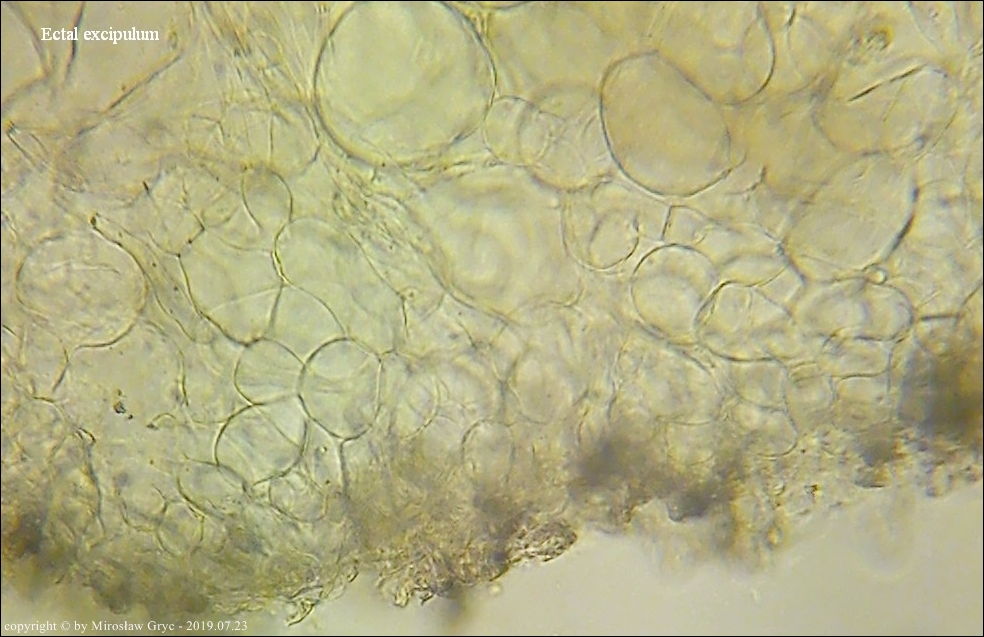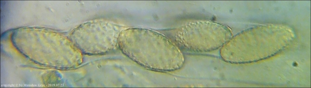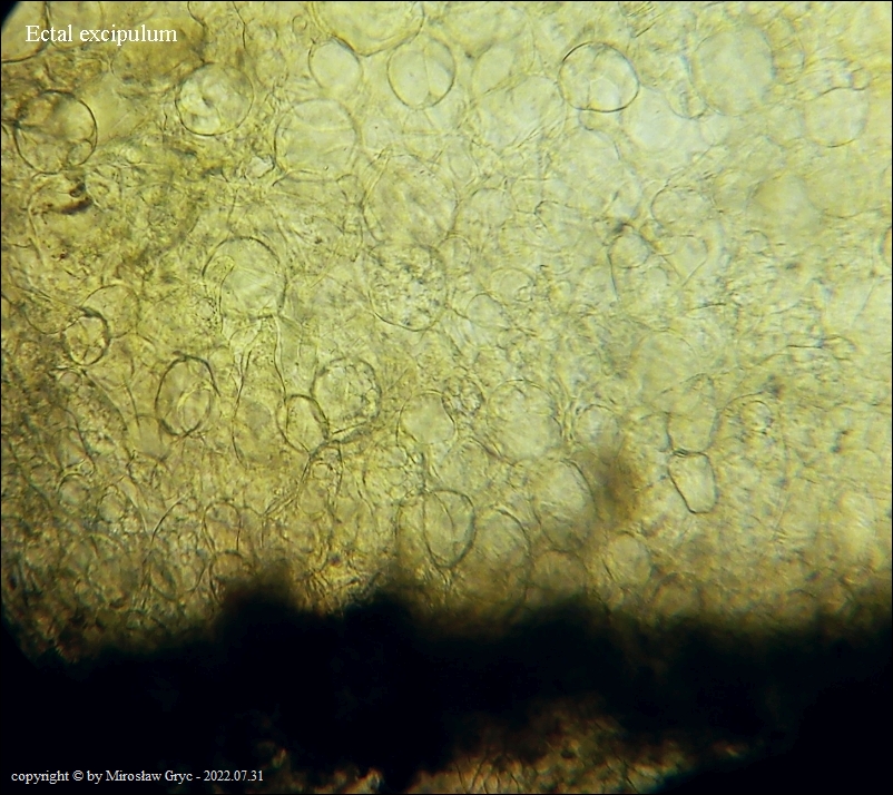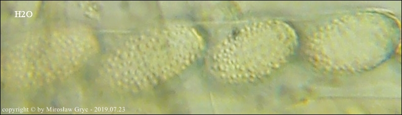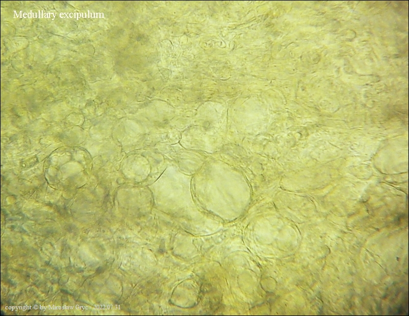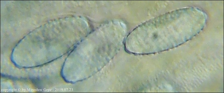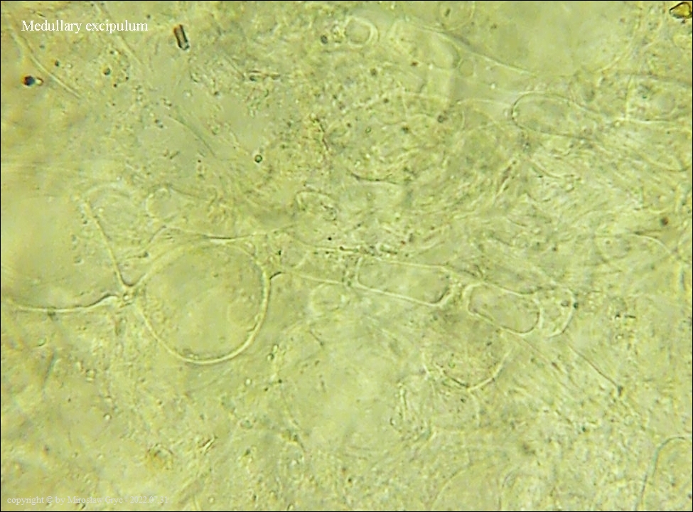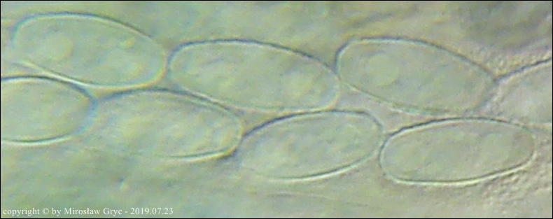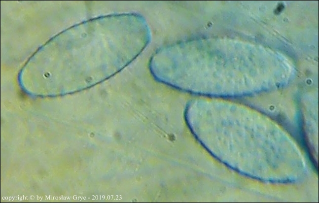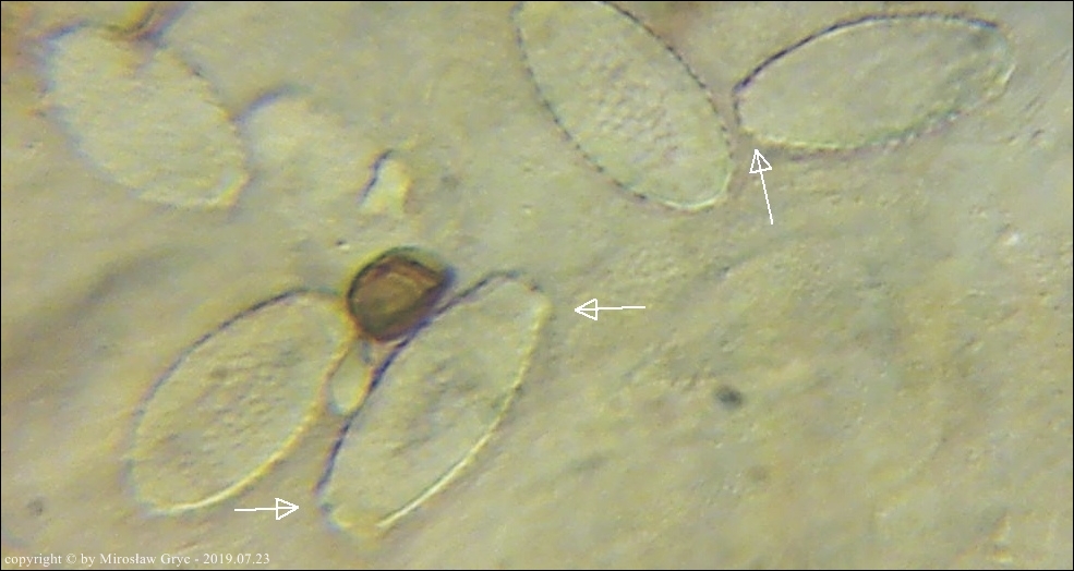 Kolekcja nieco nietypowa! Nie wystąpiła w żadnym owocniku, amyloidalna reakcja na jod. Nie są to przypadki odosobnione jednak zdażają się nader rzadko. Podejrzany jest fakt, że taka sytuacja zaistniała w obu owocnikach. Poza tym zawartość parafiz, a w zasadzie jej brak nie jest typowe dla tego gatunku. Zazwyczaj szczyty parafiz są wypełnione, mniej lub bardziej inensywnie zabarwioną na brązowo zawartością. Pomimo tych różnic pozostałe cechy wskazuja na ten gatunek. Cechy owocników pobranych z tego stanowiska później jak najbardziej pasowały do tego gatunku (patrz niżej).