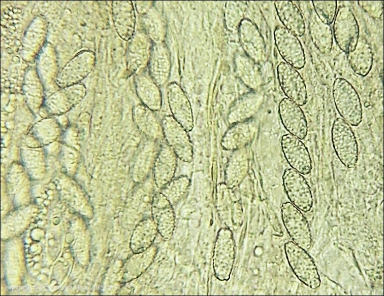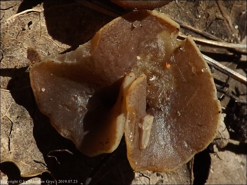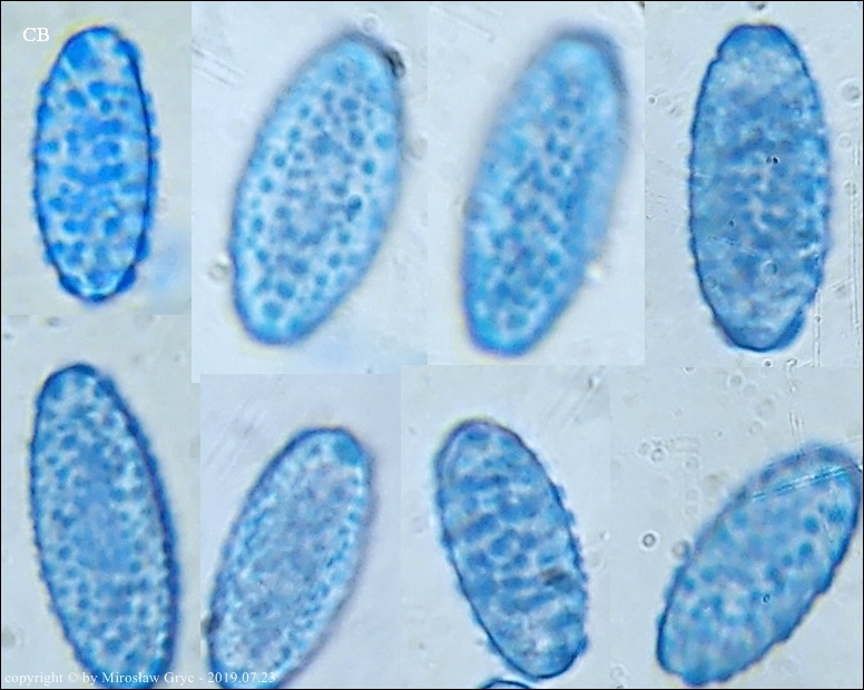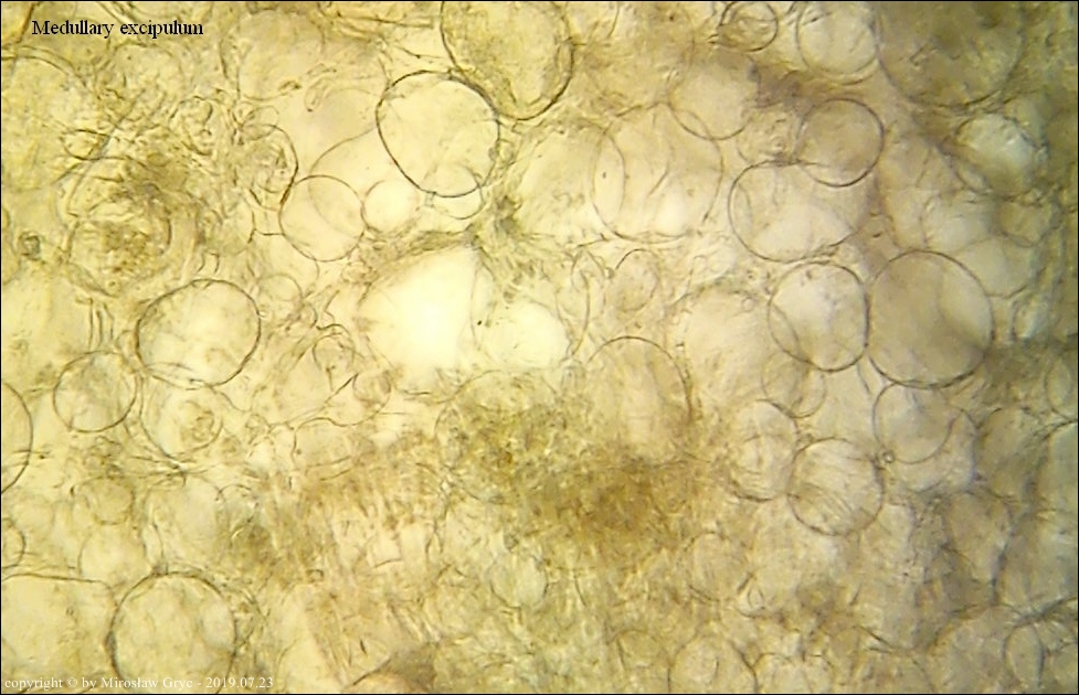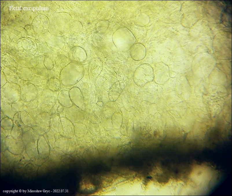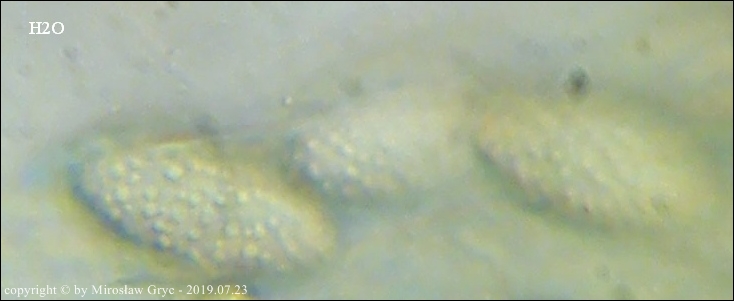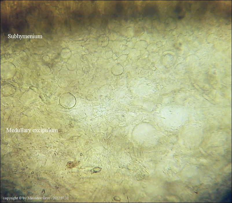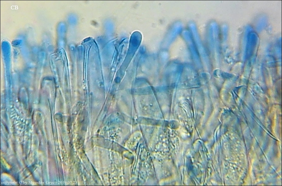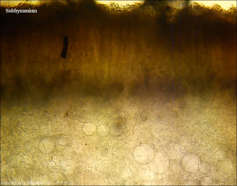 Kolekcja nieco nietypowa! Nie wystąpiła w żadnym owocniku, amyloidalna reakcja na jod. Nie są to przypadki odosobnione jednak zdażają się nader rzadko. Podejrzany jest fakt, że taka sytuacja zaistniała w obu owocnikach. Poza tym zawartość parafiz, a w zasadzie jej brak nie jest typowe dla tego gatunku. Zazwyczaj szczyty parafiz są wypełnione, mniej lub bardziej inensywnie zabarwioną na brązowo zawartością. Pomimo tych różnic pozostałe cechy wskazuja na ten gatunek. Cechy owocników pobranych z tego stanowiska później jak najbardziej pasowały do tego gatunku (patrz niżej).