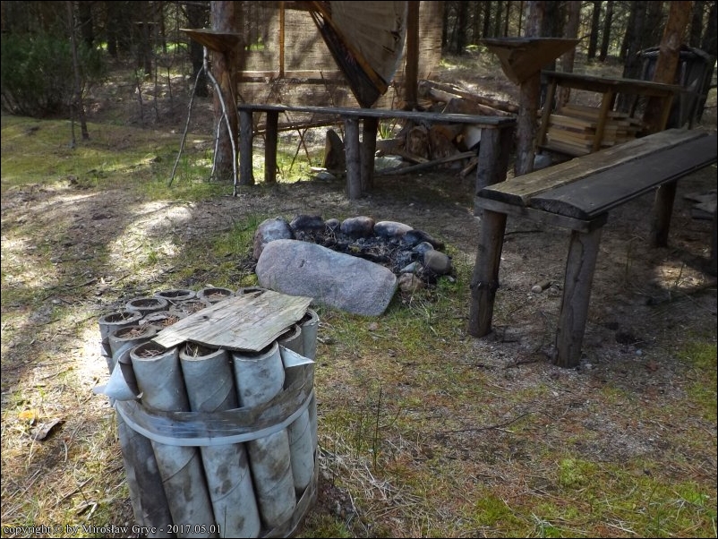 Teren ruderalny, nielegalnie zbudowana prowizoryczna wiata wraz z miejscem na ognisko.