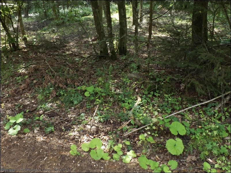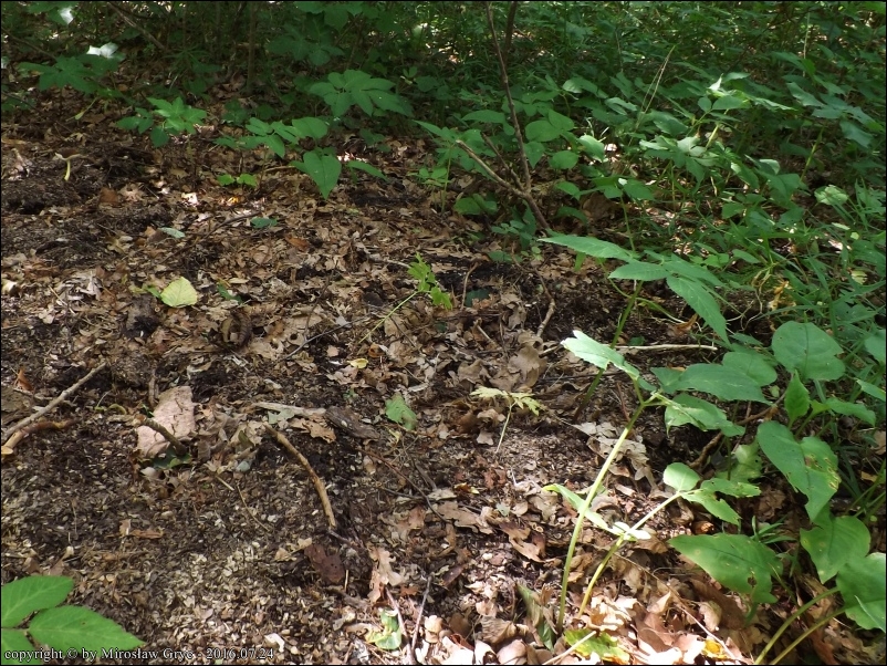 Substrat: Kilka owocników na skraju kupy trocin leżących w lesie liściastym.