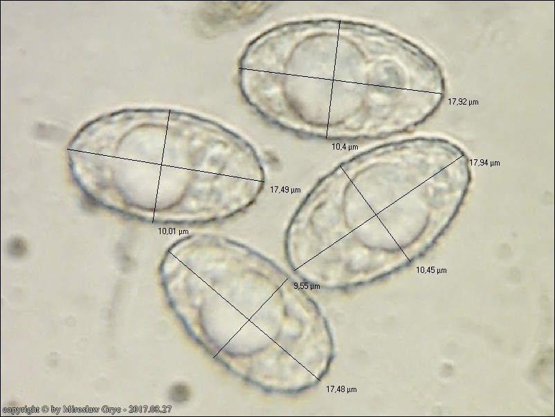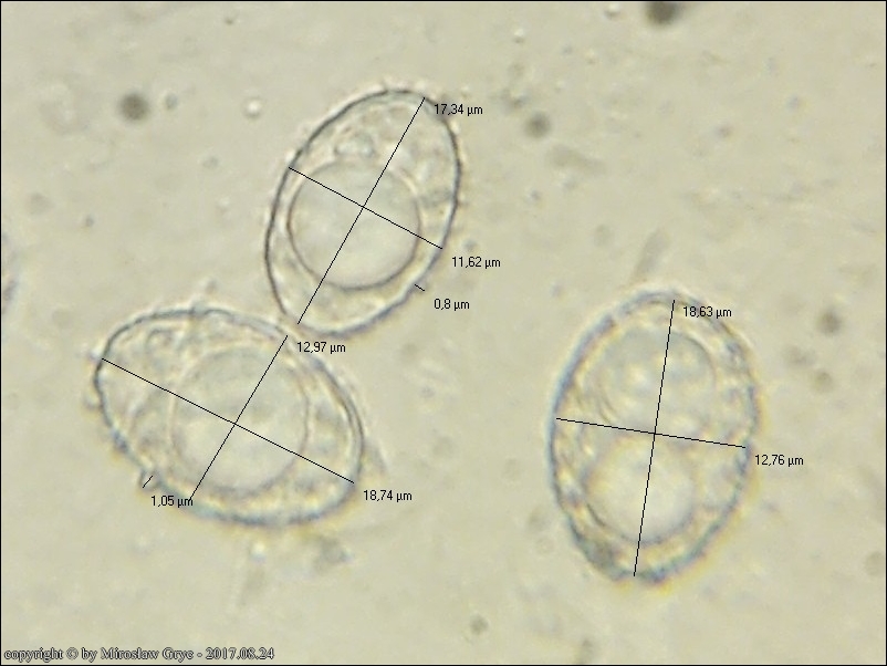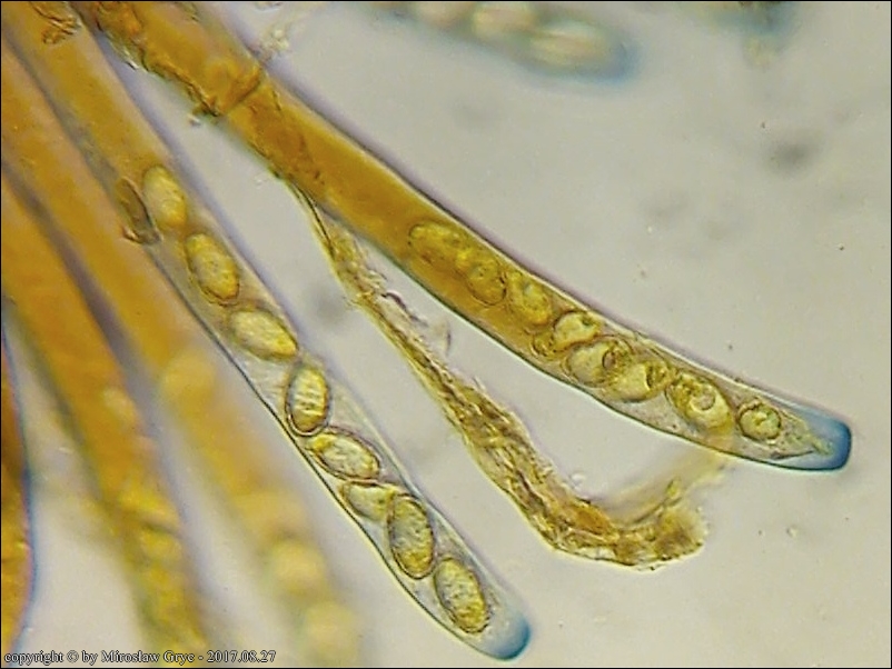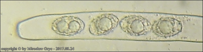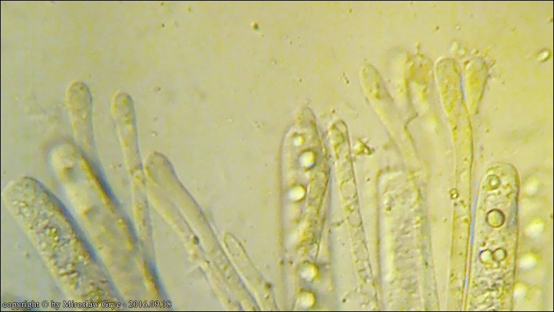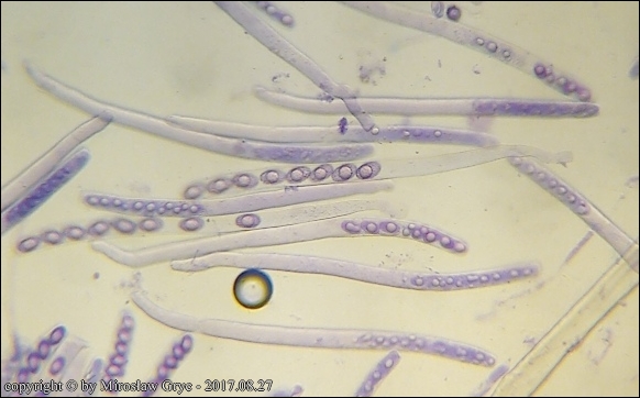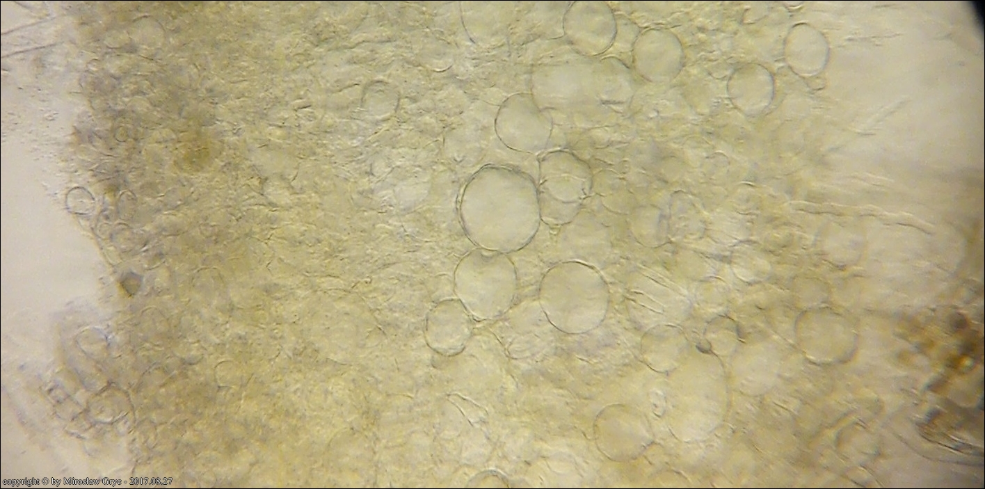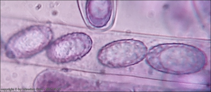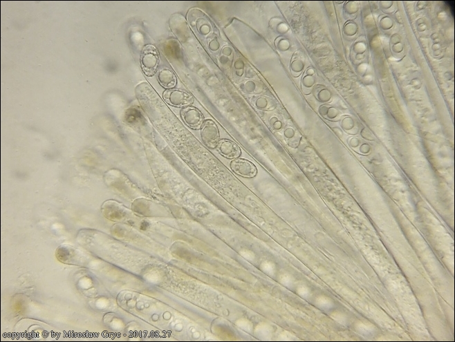 Tu jednak zauważyłem pewną regułe w stosunku do P. succosella, zależną od wieku owocników. Zarodniki słabo dojrzałe tego gatunku zazwyczaj zawierały po dwie małe lub nawet więcej kropli i dopiero w wieku dojrzałym wewnatrz nich da sie zauważyć jedną zdecydowanie większą. Zastanawiające jest jej nieregularne położenie co by sugerowało, że u tego właśnie gatunku wraz z wiekiem jedna z kropli jest jakoby "wchłaniana" przez drugą. Badając dojrzałe owocniki, takie jak chociażby znalezisko z dnia 2017.08.27 (patrz niżej) trudno dopatrzeć się jakichkolwiek odchyłek od opisywanej P. succosella. Zarodniki z jedna dużą kroplą, wypełnione brązową treścią parafizy, ciemne hymenium, w sumie nie ma się do czego przyczepić. Spotykam jednak identycznie wyglądające, posiadające dwie krople w zarodnikach, parafizy jednak bez zdecydowanie ciemnej treści, mimo tego, że hymenium owocnika jest dość ciemnej barwy.