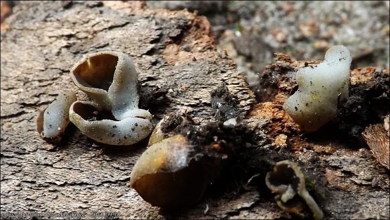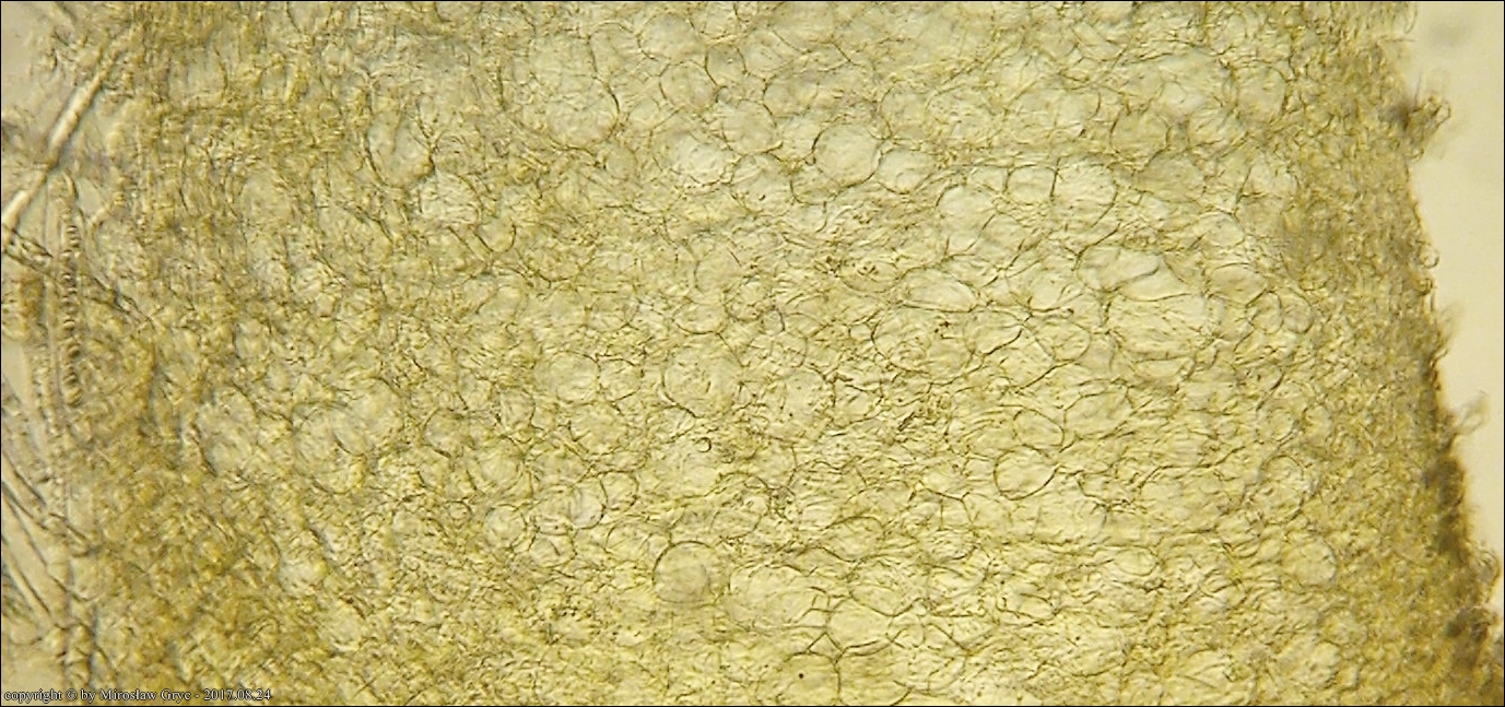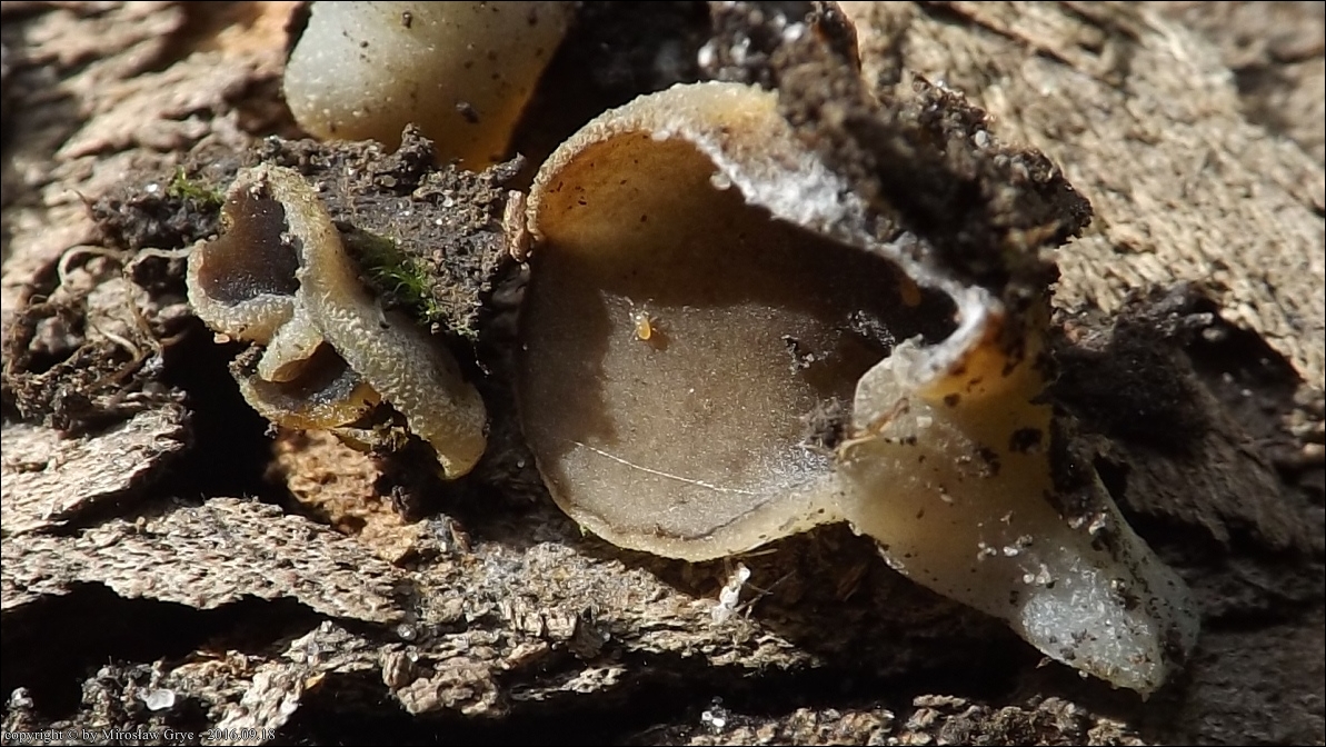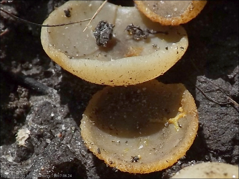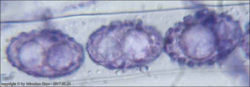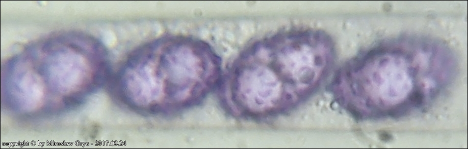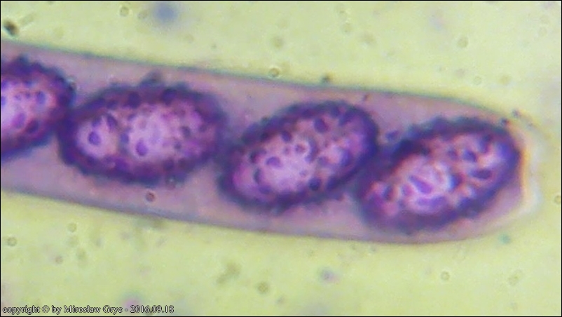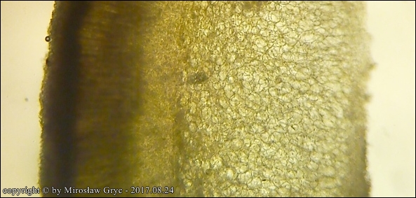 Tu jednak zauważyłem pewną regułe w stosunku do P. succosella, zależną od wieku owocników. Zarodniki słabo dojrzałe tego gatunku zazwyczaj zawierały po dwie małe lub nawet więcej kropli i dopiero w wieku dojrzałym wewnatrz nich da sie zauważyć jedną zdecydowanie większą. Zastanawiające jest jej nieregularne położenie co by sugerowało, że u tego właśnie gatunku wraz z wiekiem jedna z kropli jest jakoby "wchłaniana" przez drugą. Badając dojrzałe owocniki, takie jak chociażby znalezisko z dnia 2017.08.27 (patrz niżej) trudno dopatrzeć się jakichkolwiek odchyłek od opisywanej P. succosella. Zarodniki z jedna dużą kroplą, wypełnione brązową treścią parafizy, ciemne hymenium, w sumie nie ma się do czego przyczepić. Spotykam jednak identycznie wyglądające, posiadające dwie krople w zarodnikach, parafizy jednak bez zdecydowanie ciemnej treści, mimo tego, że hymenium owocnika jest dość ciemnej barwy.