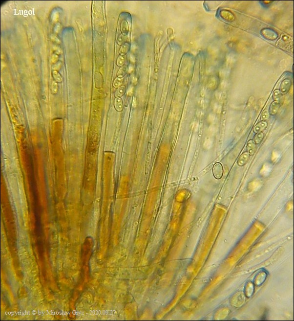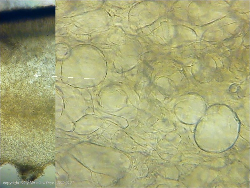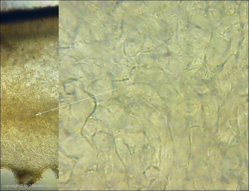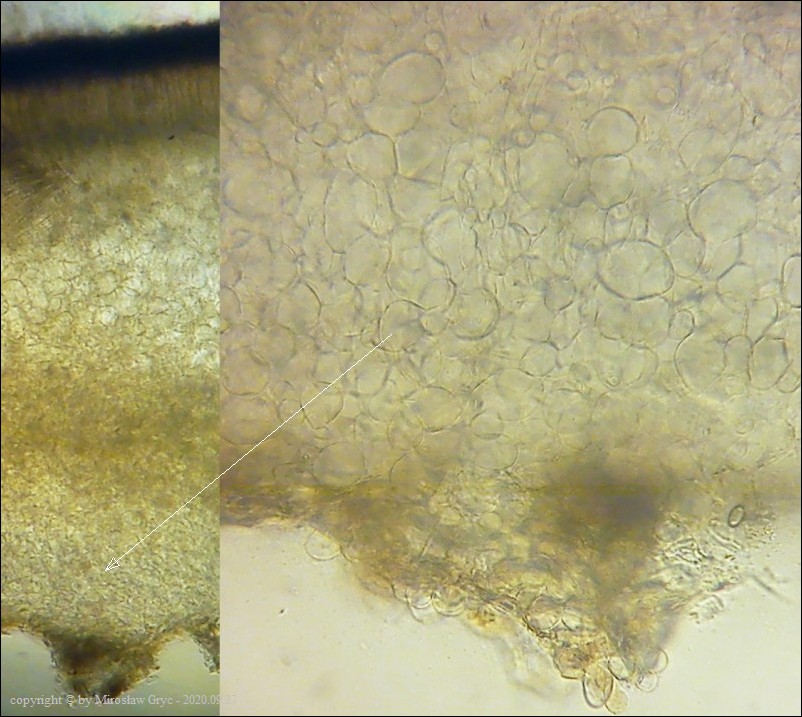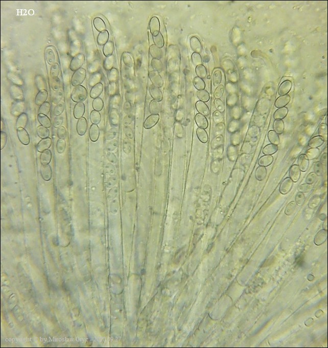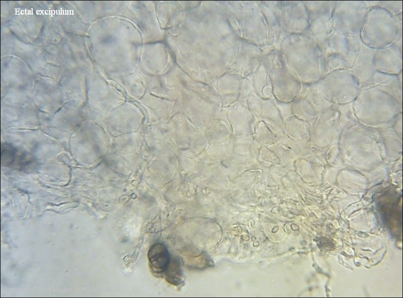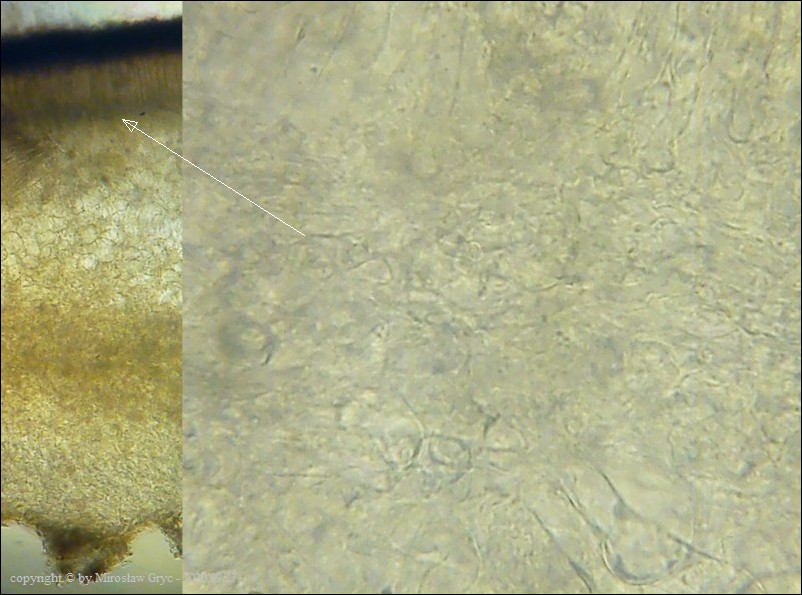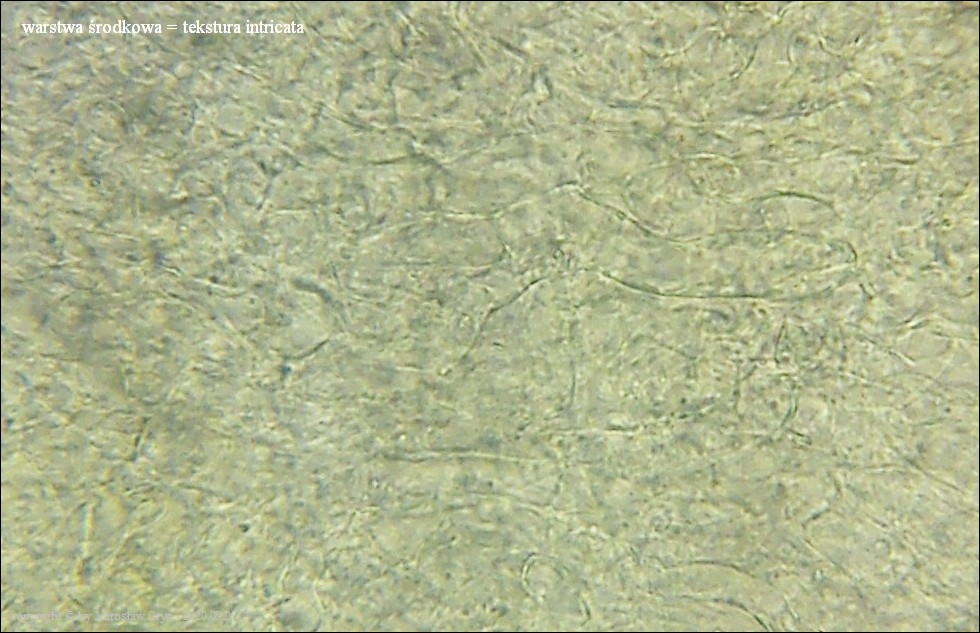 - zarodniki z bardzo drobnymi brodawkami (zaledwie chropowate) oraz z dwiema kroplami. Ciało owocnika bez środkowej warstwy złożonej z "tekstura intricata".
