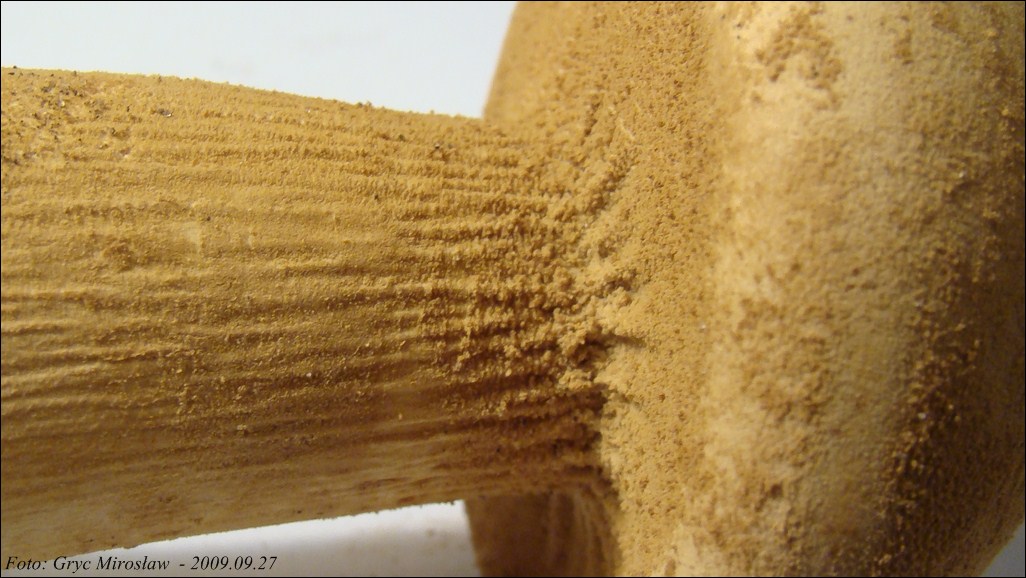 Wysyp zarodników ochrowo-rdzawo-brązowy. Zarodniki wrzecionowate, wygięte, powierzchnia szorstka (drobno brodawkowana), 9-12 x 4-5 µm.
