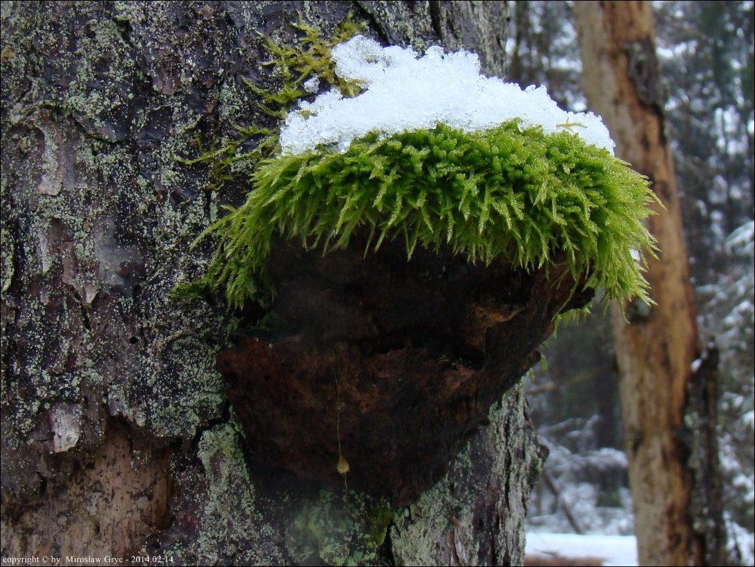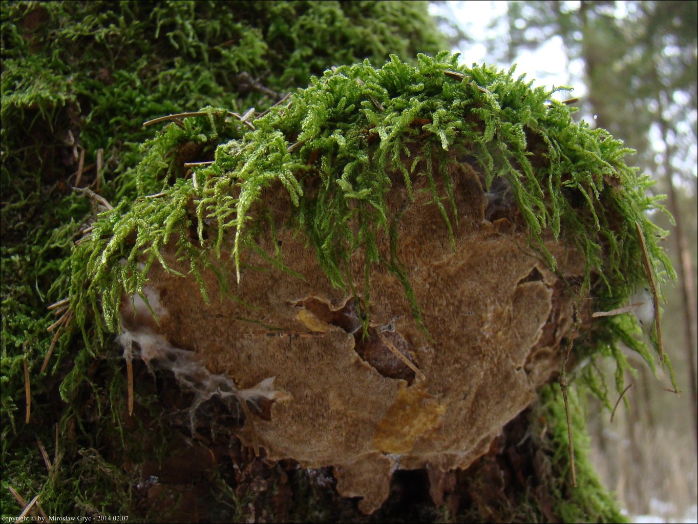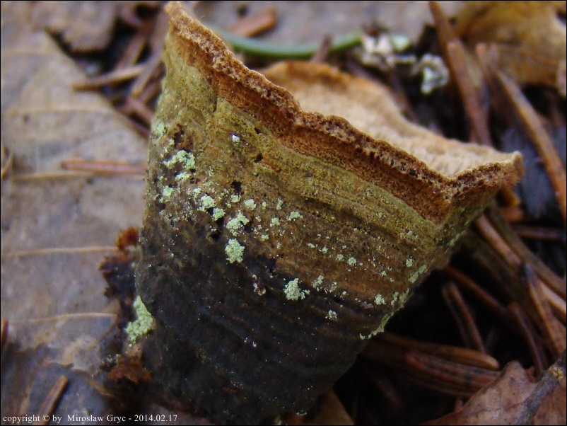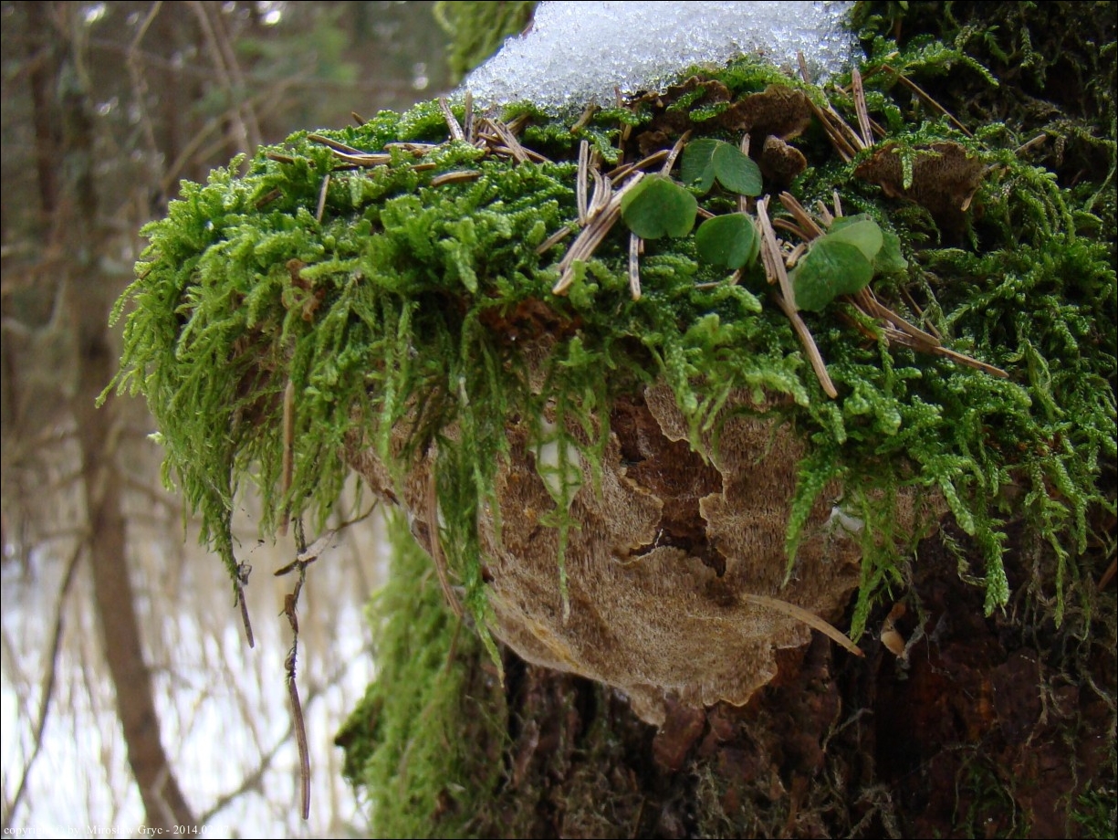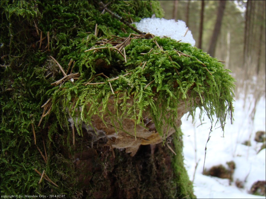 Substrat: Kilka owocników na pozostałym, wysokim pniu świerka, złamanego najpewniej przez wiatr.