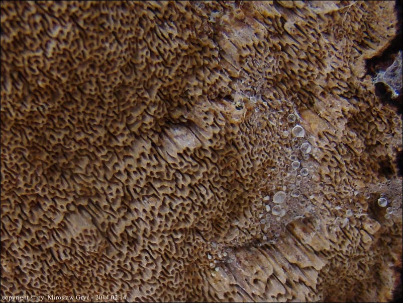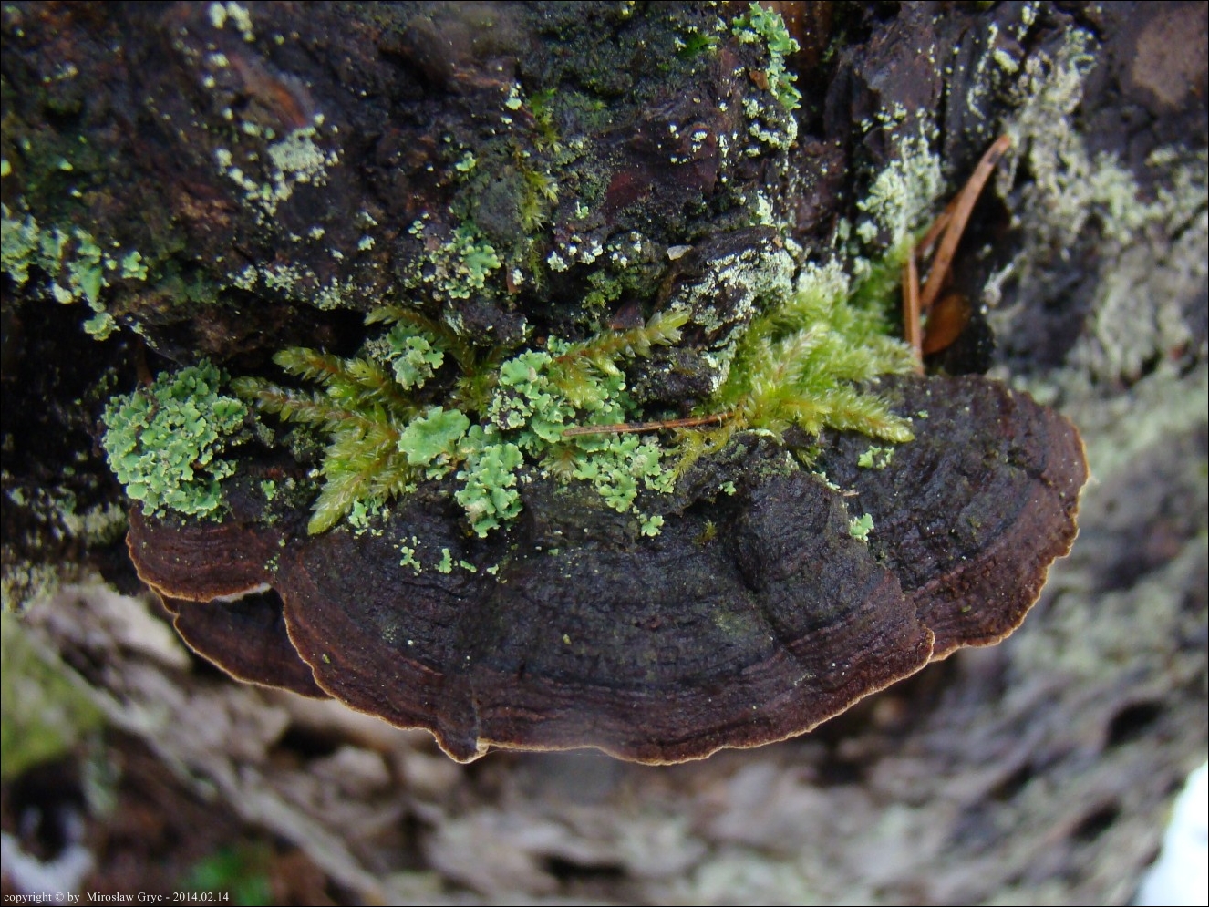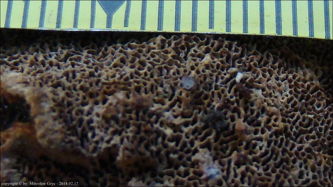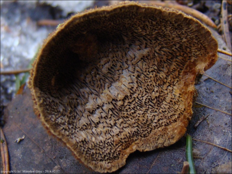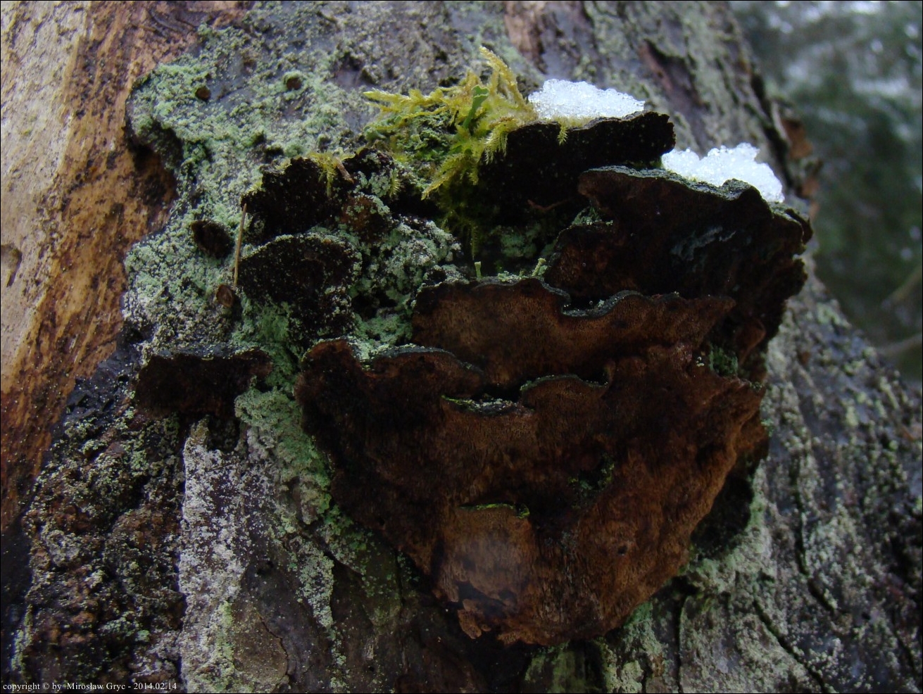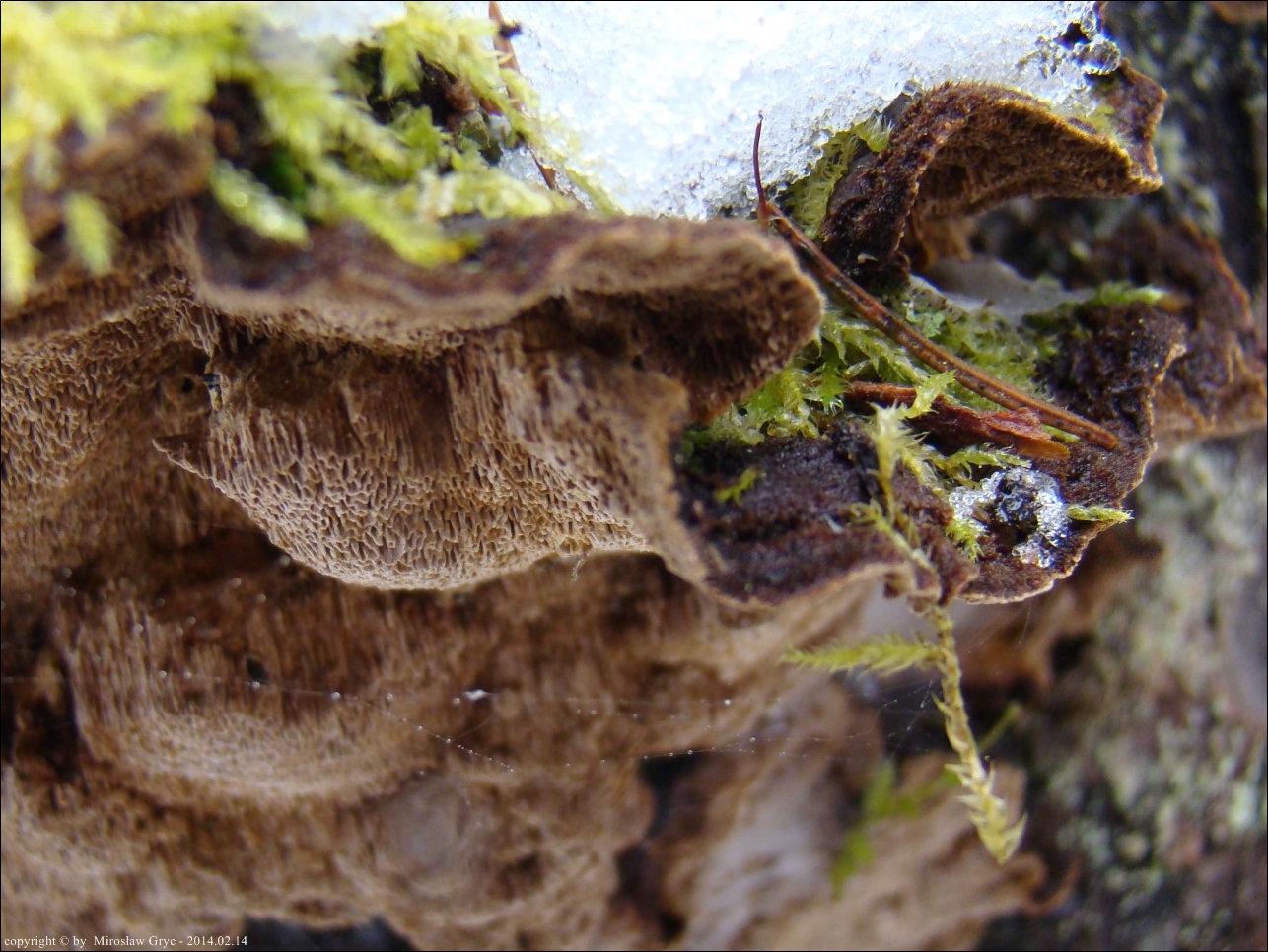 Substrat: Kilka owocników na pozostałym, wysokim pniu świerka, złamanego najpewniej przez wiatr.