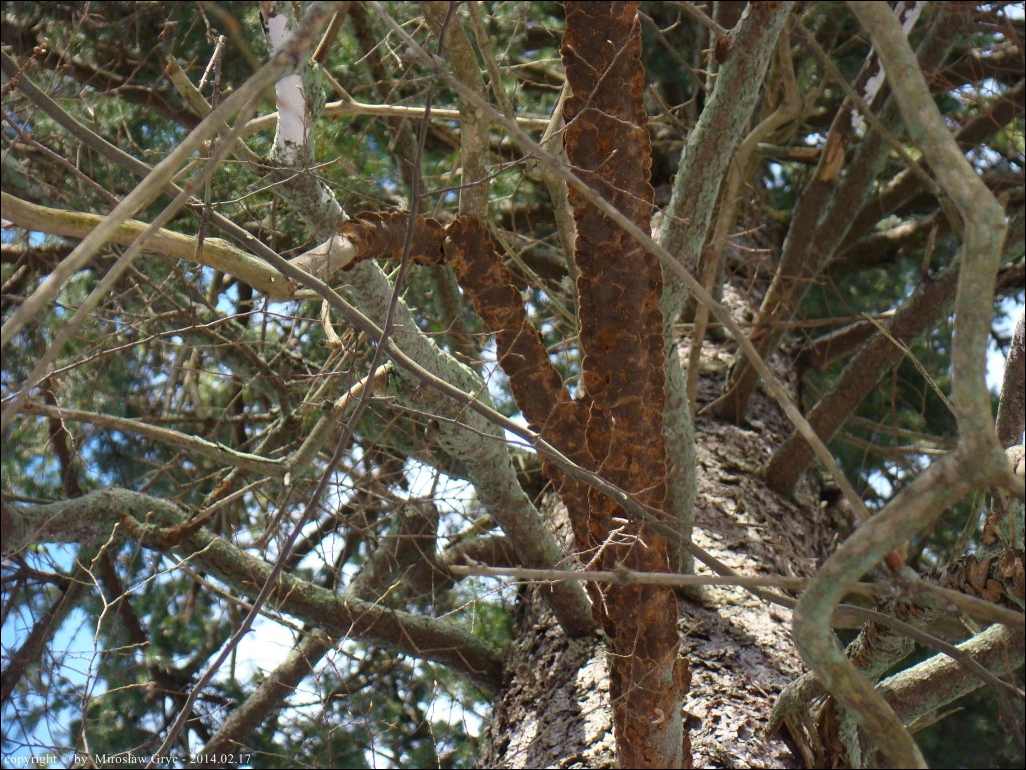 Substrat: Owocniki na martwych gałęziach dorodnego świerka, na wysokości około 5-6 m nad ziemią.