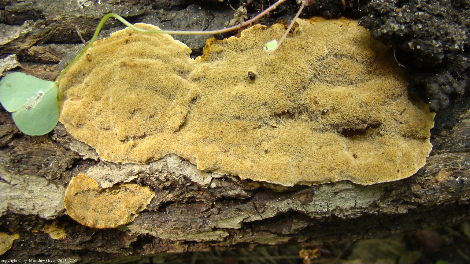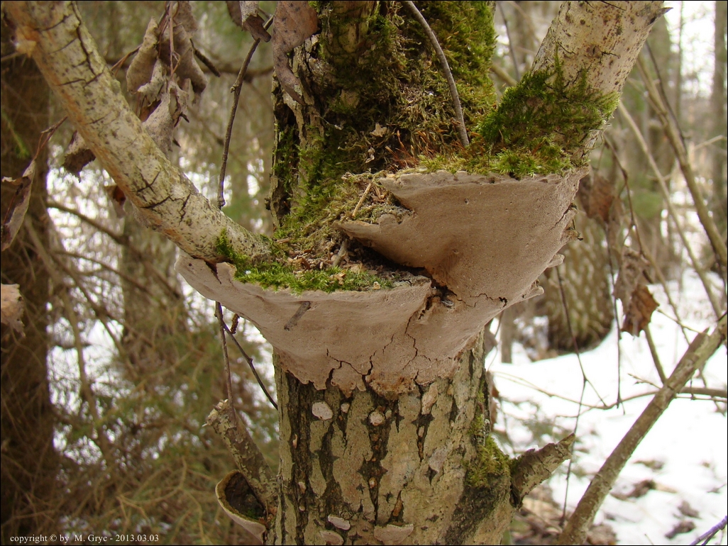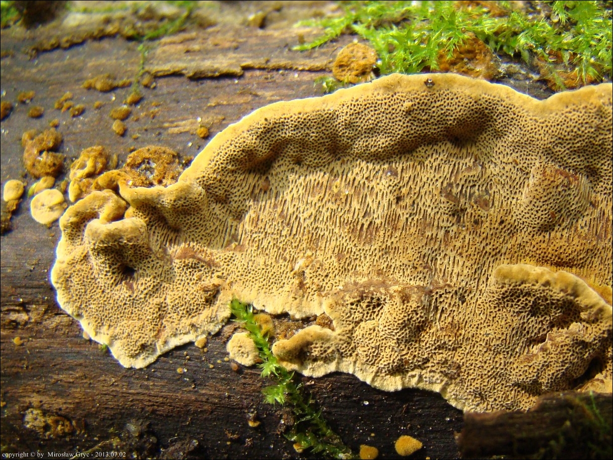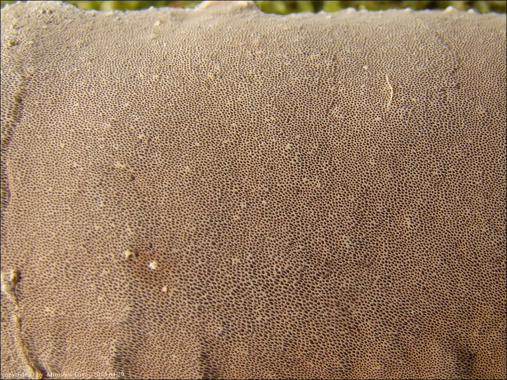 | ID: 230738 z dn. 2013.12.29. (ATPOL: GC-02) | Około 6 km na NE od Supraśla, Puszcza Knyszyńska, pow. białostocki, woj. podlaskie. | Las mieszany (grab, dąb, świerk, inne rzadziej), na dość młodej, zgiętej i obumierającej wierzbie, owocniki w dwóch miejscach. Stanowisko ujęte w pracy zespołowej: Grzyby Puszczy Knyszyńskiej - Anna Kujawa, Błażej Gierczyk, Mirosław Gryc, Marek Wołkowycki - 2019 rok. |