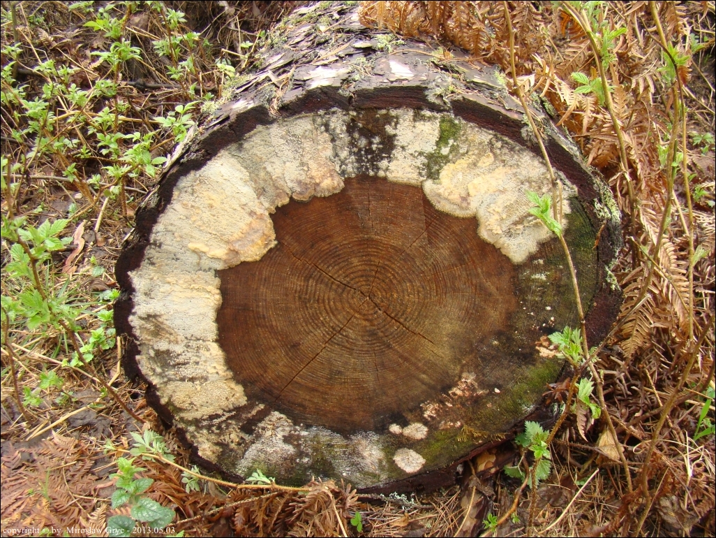Substrat: Na czołowej powierzchni kloca sosnowego leżącego na ziemi.