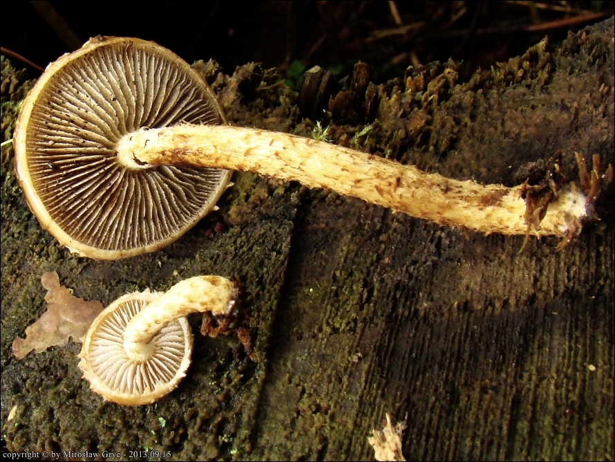 Substrat: Dwa owocniki wewnątrz zbutwiałęgo częściowo pniaka, prawdopodobnie świerkowego. Gatunek określony mikroskopowo przez B. Gierczyka.