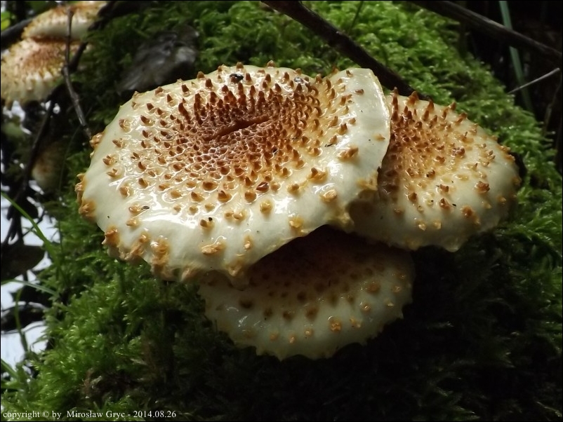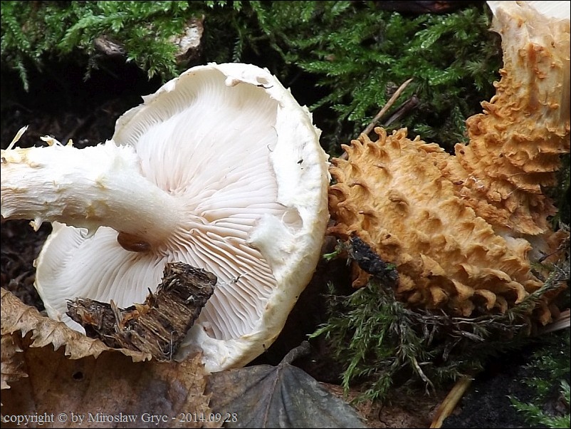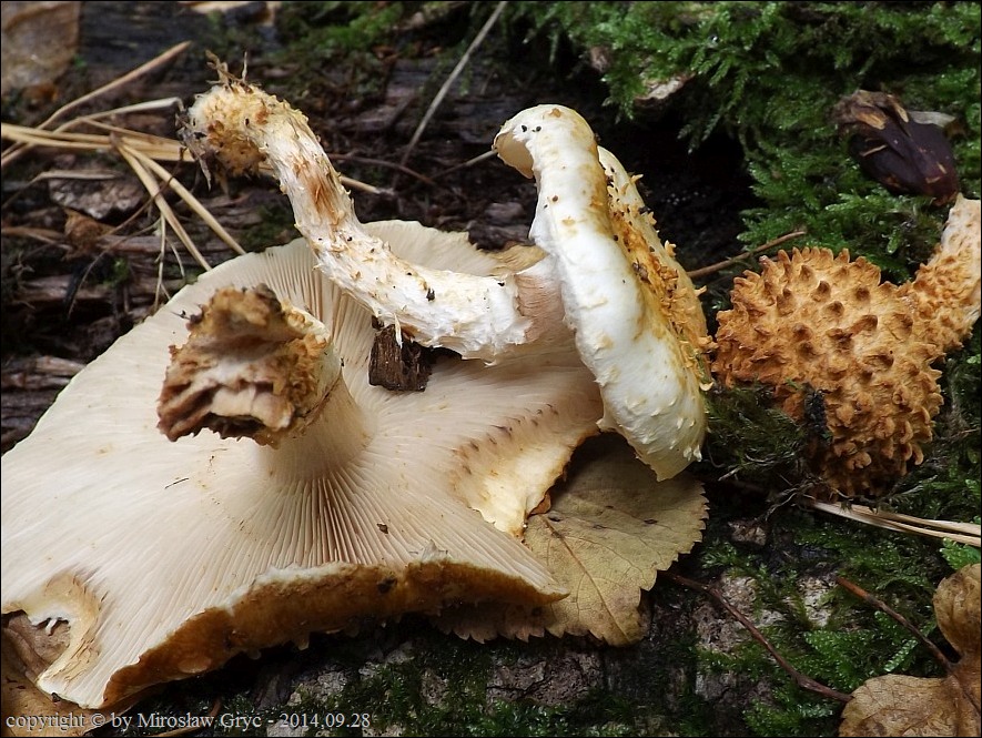 średnicy (2.5)3-7(11) cm, wypukły niekiedy z szerokim garbkiem, z wiekiem coraz bardziej rozpostarty, prawie do płaskiego; barwy białawej, czasem z odcieniem cynamonowym; brzeg długo pozostaje podwinięty, z dobrze widocznymi resztkami osłony przez co sprawia wrażenie wełnistego; powierzchnia lekko lepka lub sucha w zależności od pogody, pokryta wyraźnymi łuskami; łuski rozmieszczone dość nieregularnie, ku brzegowi kapelusza coraz rzadsze, barwy wyraźnie ciemniejszej od powierzchni kapelusza (ochrowej), pod łuskami w skórce kapelusza występuje galaretowata warstwa.