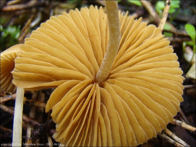 Substrat: grupka owocników w głębokim mchu. Gatunek określony mikroskopowo przez Błażeja Gierczyka.