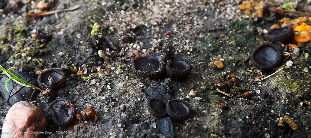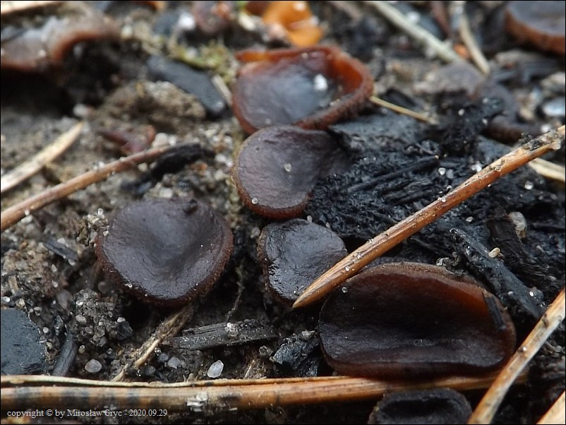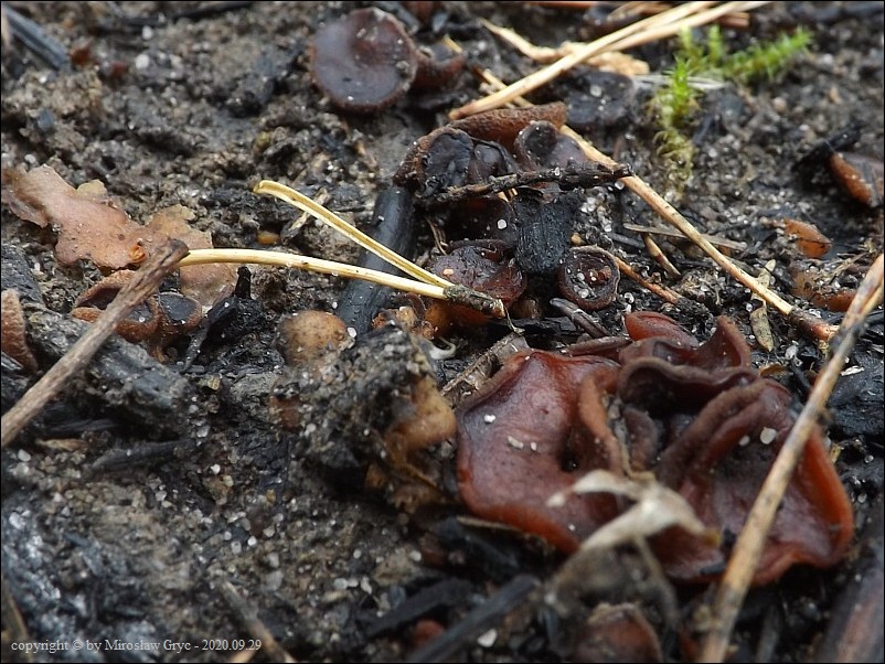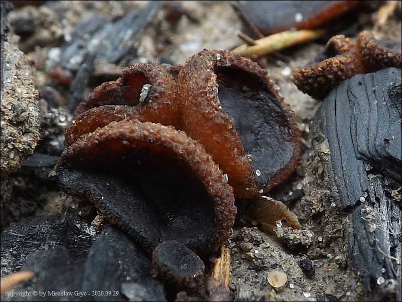 Substrat: Owocniki na dwóch stanowiskach połozonych w bliskiej odległości, rosnące na węglu pozostałym po palonych ogniskach.