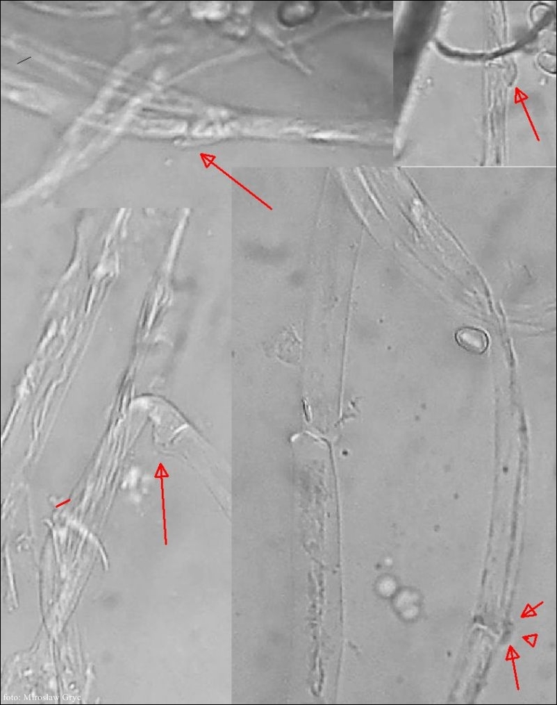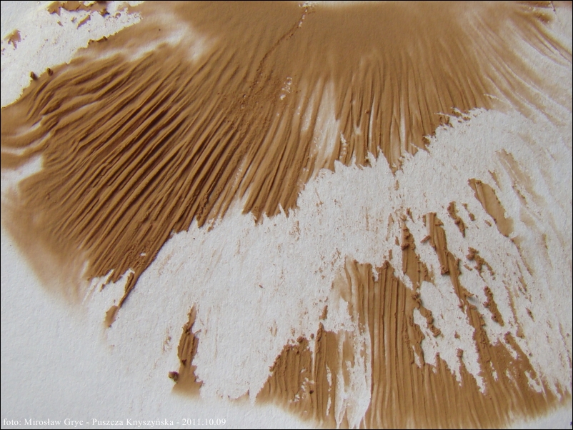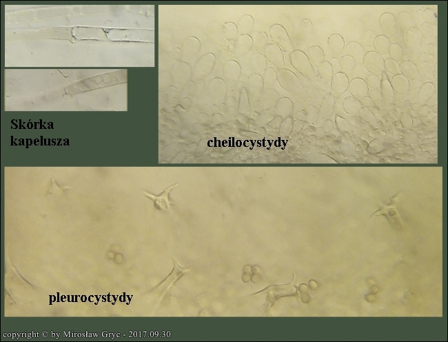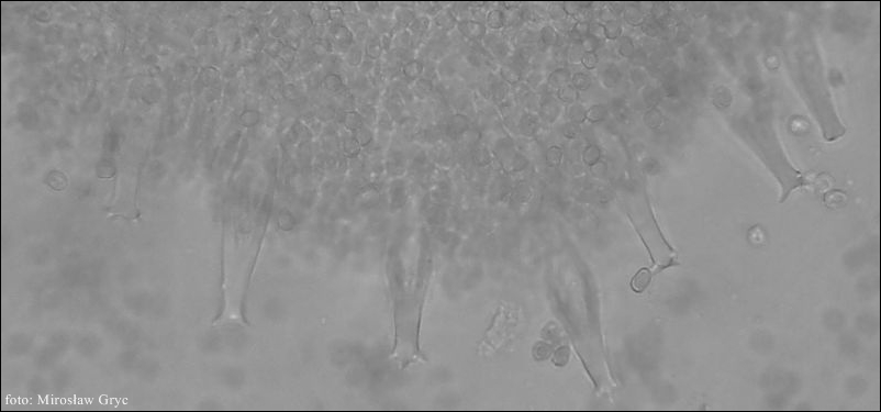 Wysyp widoczny na zdjęciu nr. 04 w galerii. Pleurocystidia: 70-90 × 13-22µm, z 2-4 haczykowatymi wyrostkami, wąsko wrzecionowate.