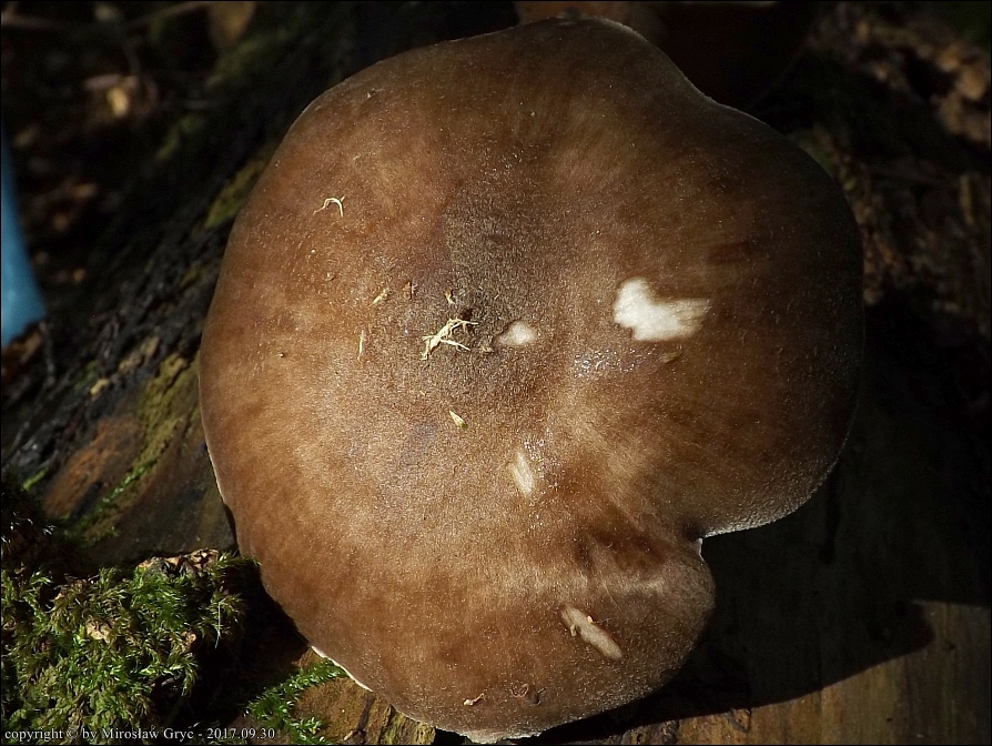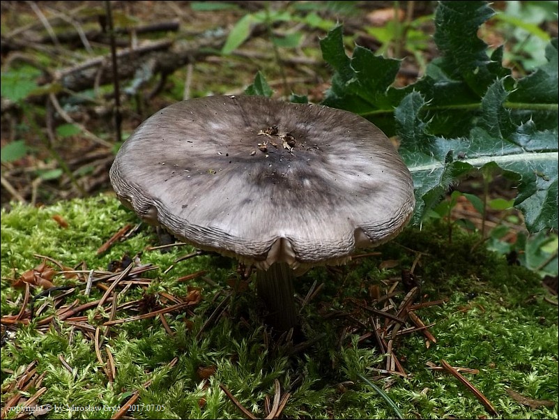 kształtu wypukłego lub płasko wypukłego, z centralnym nieznacznym wgłębieniem lub tępym garbkiem; średnicą osięga maksymalnie 9 cm, barwy szarawej, szarobrązowej, promieniście włókienkowany; brzeg ostry, zazwyczaj nieco jaśniejszy, może być nieznacznie prążkowany.
