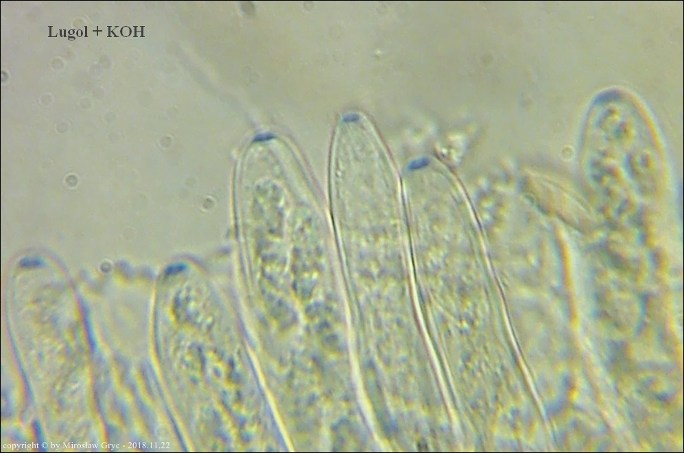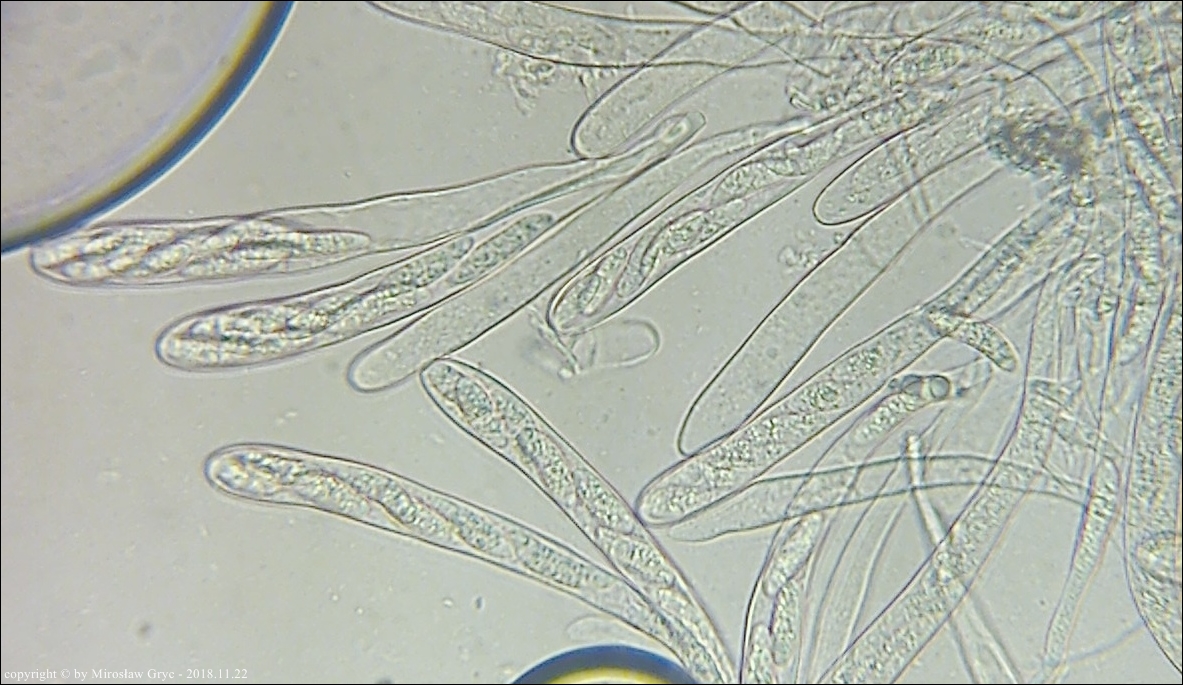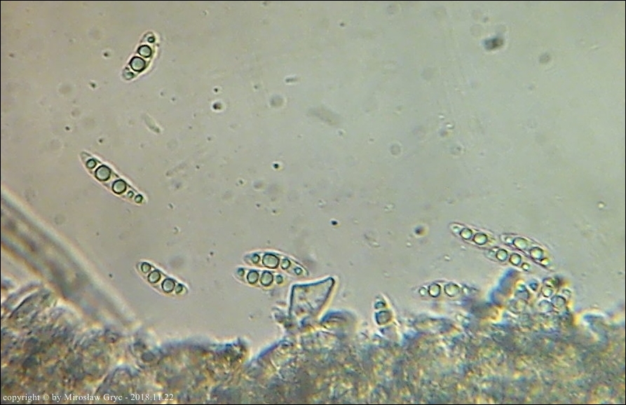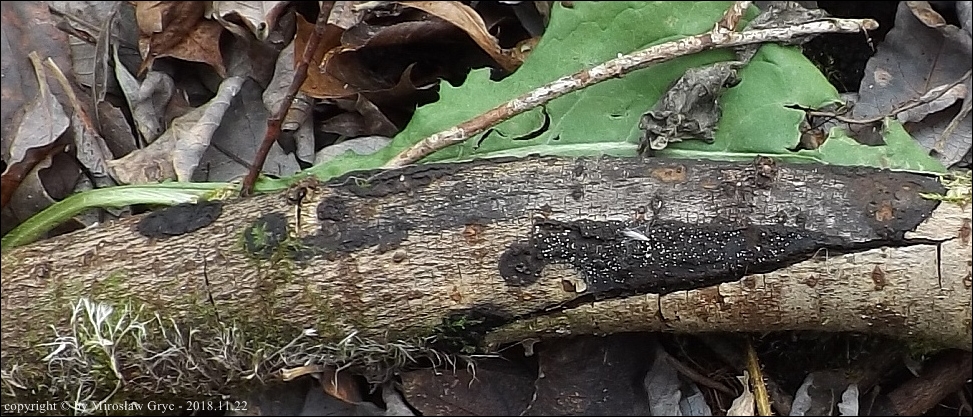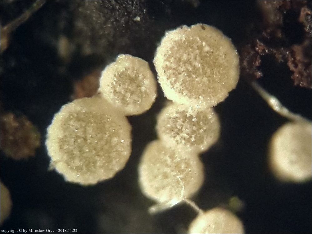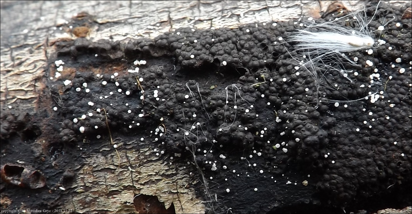 Substrat: Owocniki na dolnej stronie leżącego na ziemi fragmentu drewna.