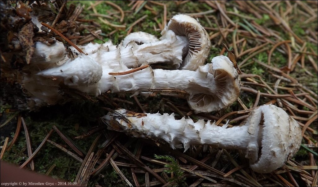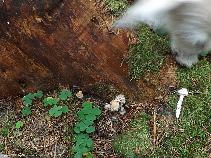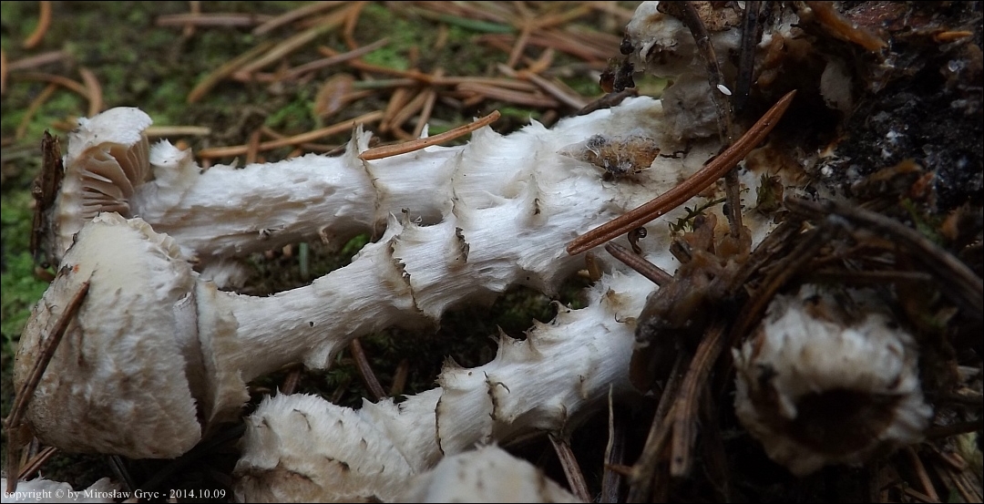 Owocniki tuż u podstawy pniaka po ściętym świerku.