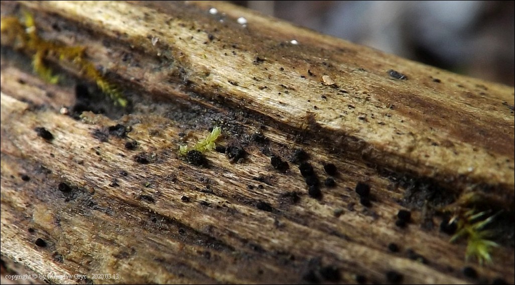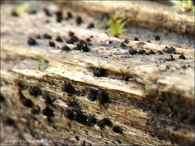 Substrat: Owocniki na pniu, złamanego krzewu czarnego bzu (Sambucus nigra) .