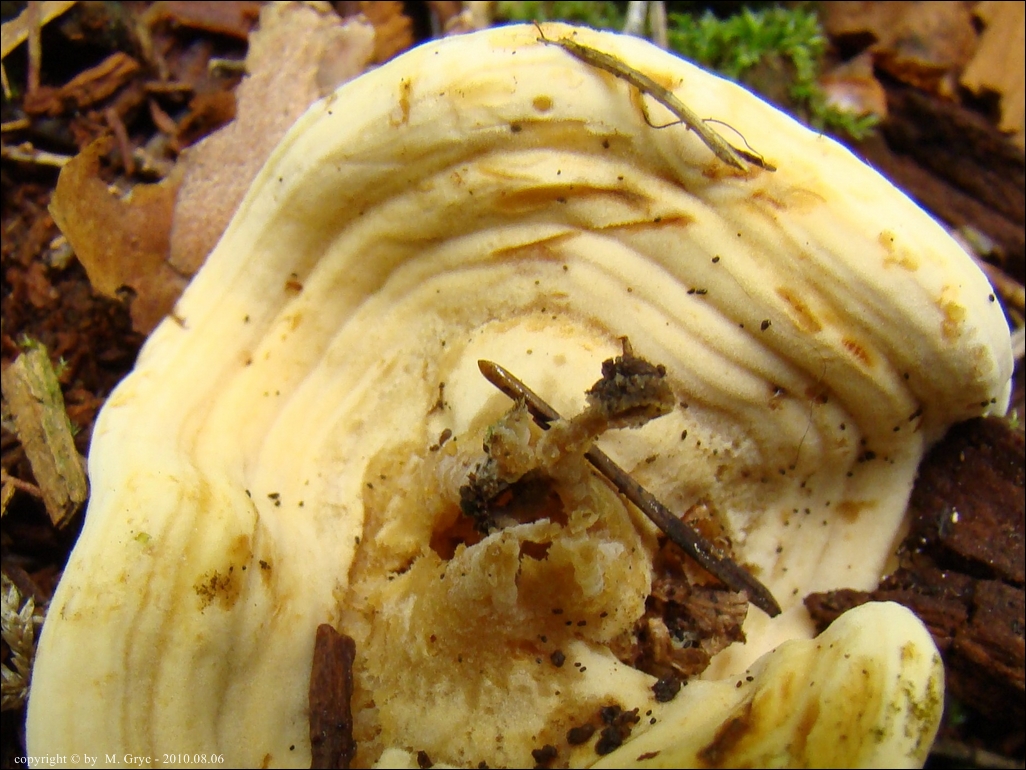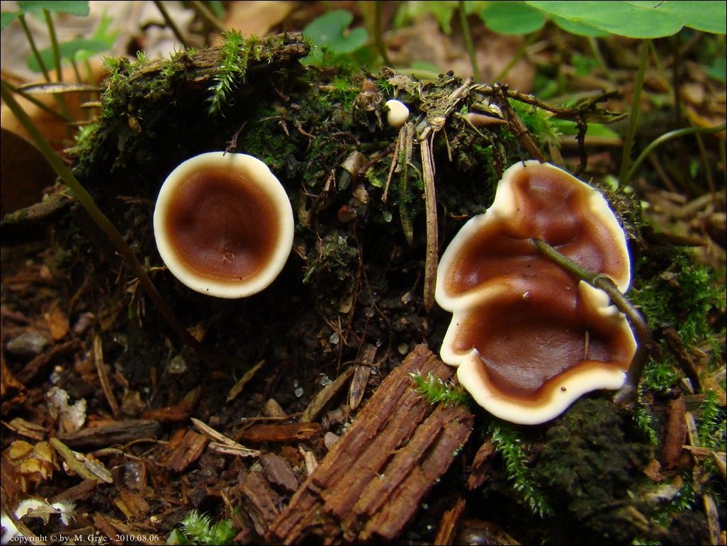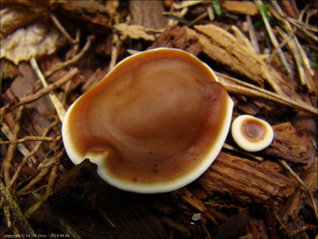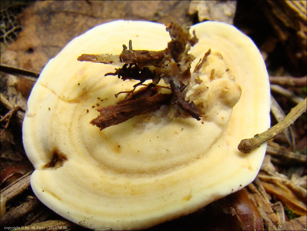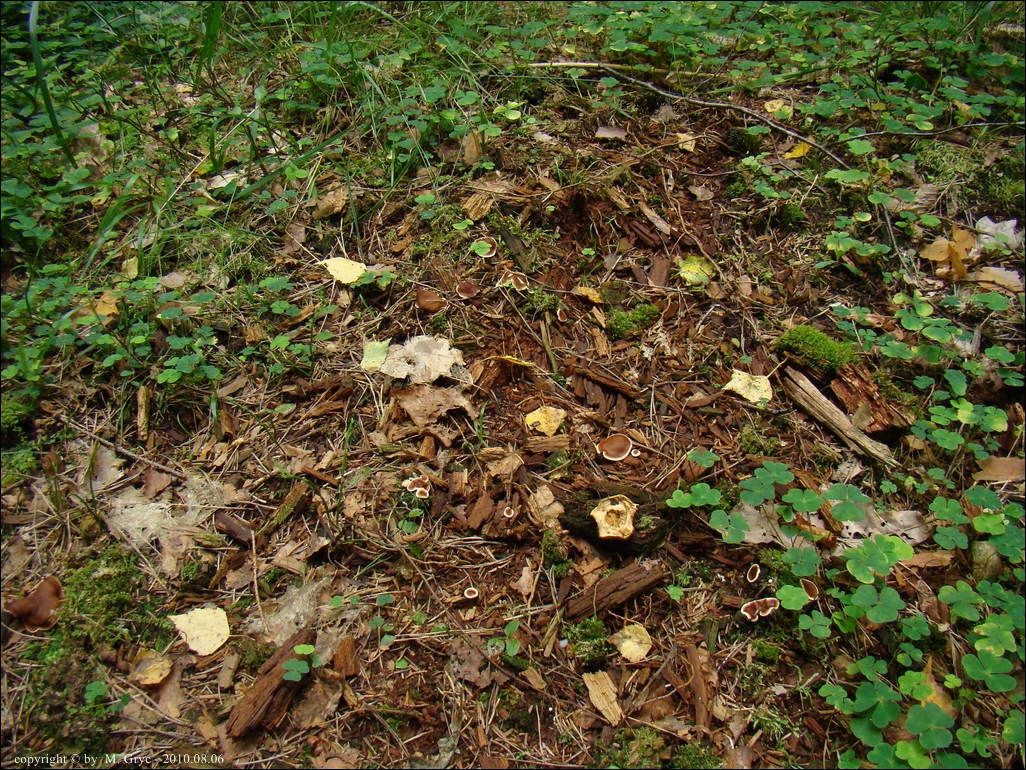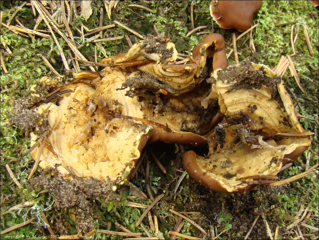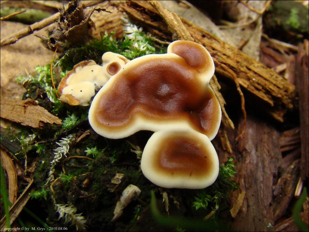 Substrat: Z lekka wyjeżdżona droga leśna, owocniki wyrastały na prawie całkowicie zbutwiałym pniaku oraz obok niego.