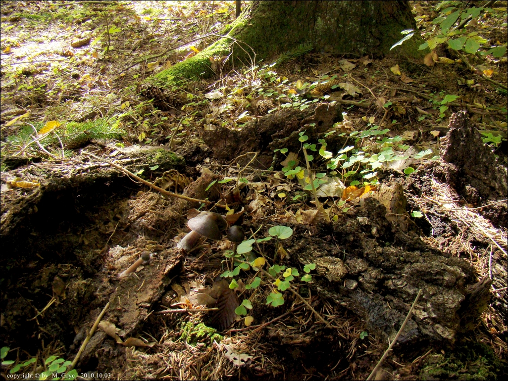Lokalizacja: Puszcza Knyszyńska, Czółnowo, kilka owocników na rozsypanym próchnie z prawie całkowicie zbutwiałego pnia.