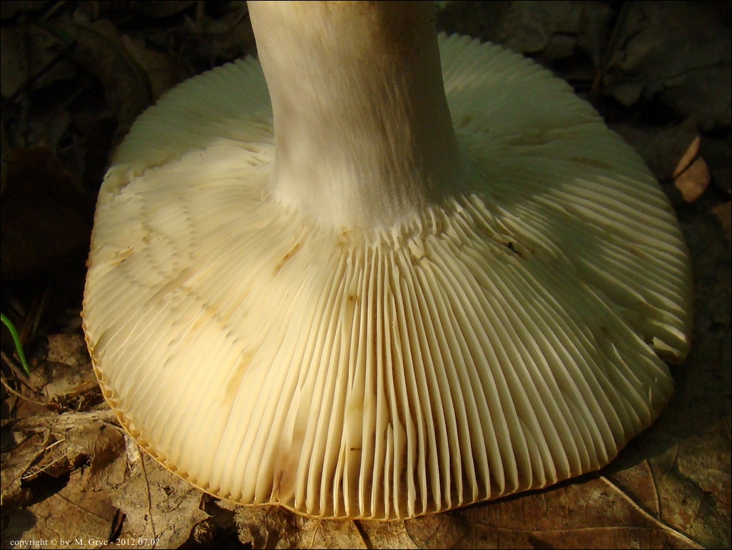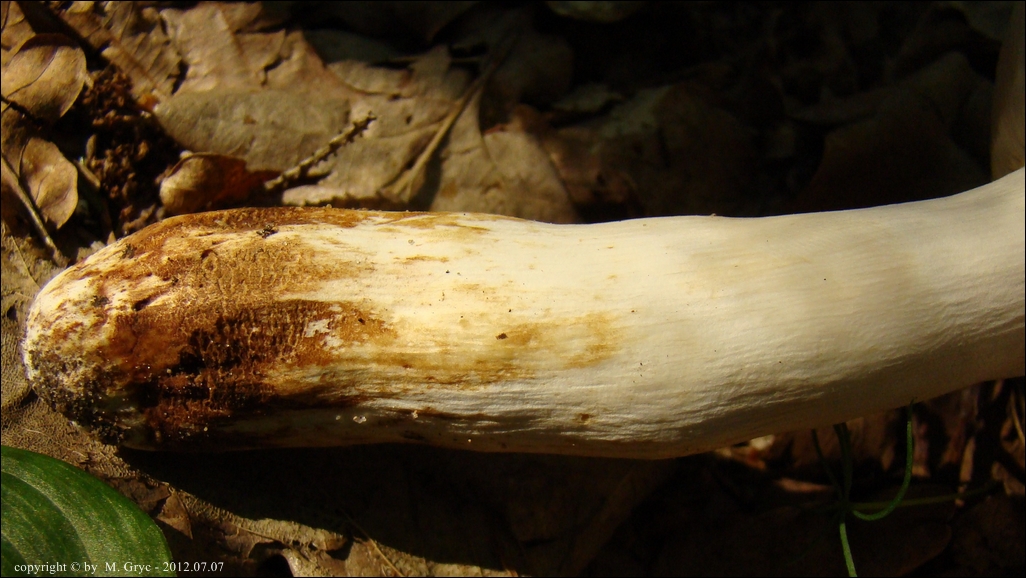 Miąższ – stosunkowo cienki, w kapeluszu jędrny, białawy, niezmienny po uszkodzeniu, w trzonie z wiekiem watowaty i komorowaty, od podstawy zmieniający barwę na ciemnordzawą; smak zazwyczaj ostry o różnej intensywności; zapach gorzkich migdałów, zazwyczaj intensywny.