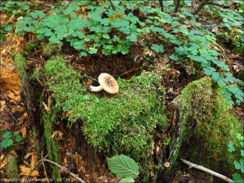 Jeden owocnik na zbutwiałym pniaku, prawdopodobnie jakiegoś liściastego.