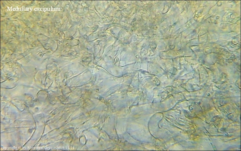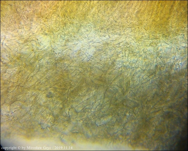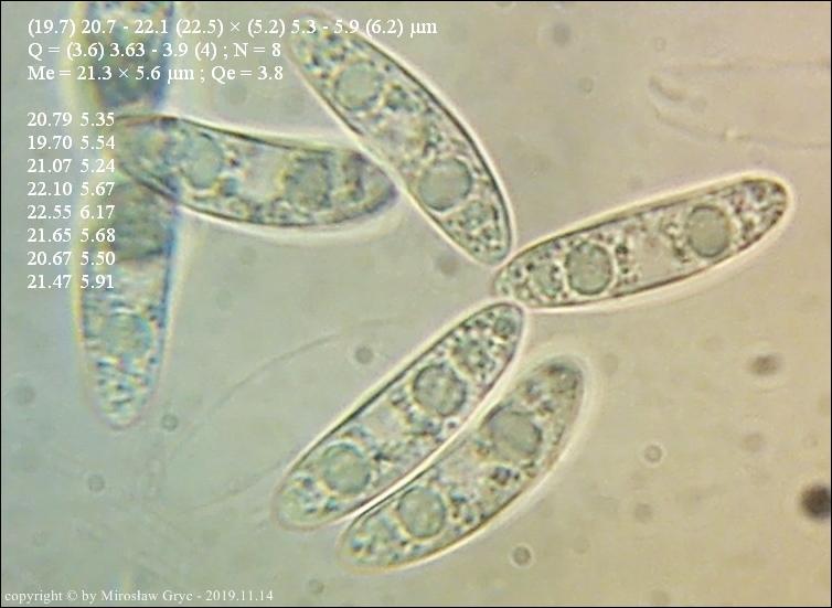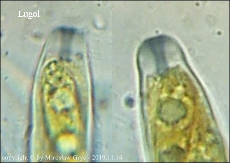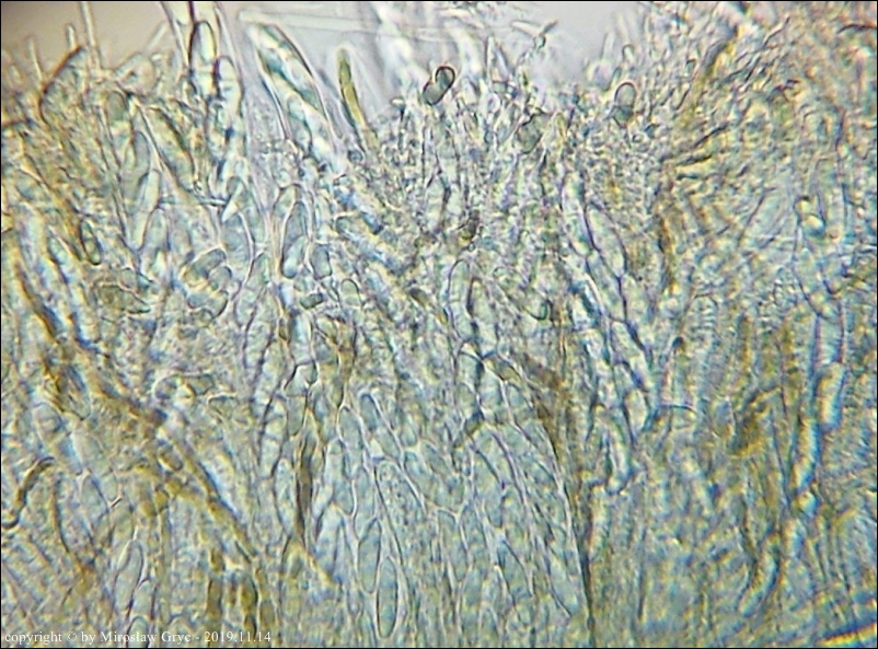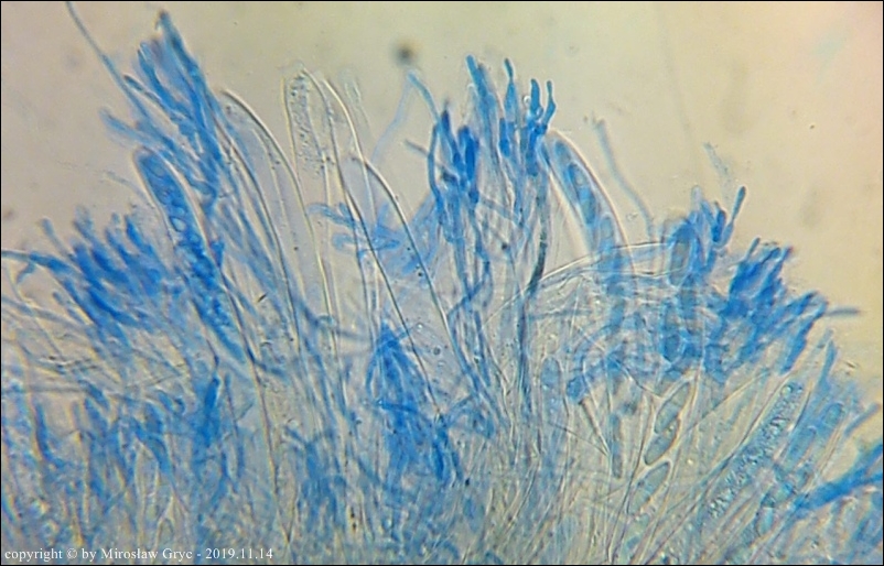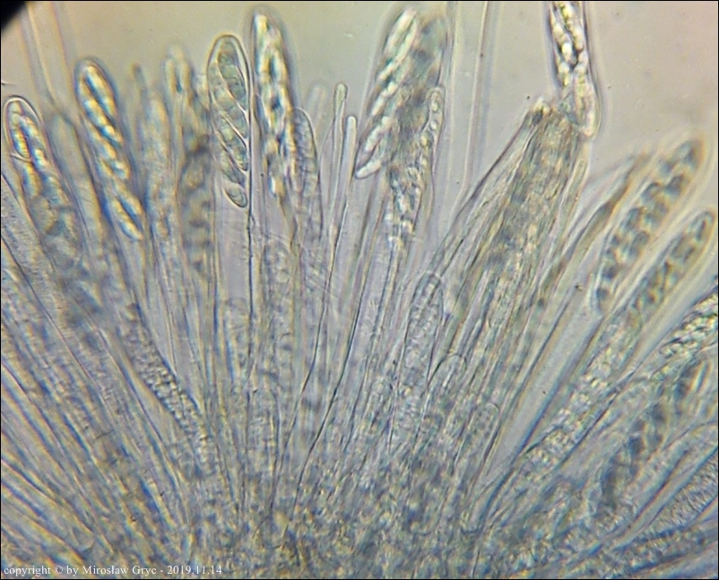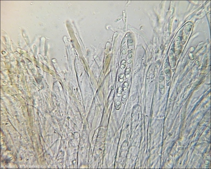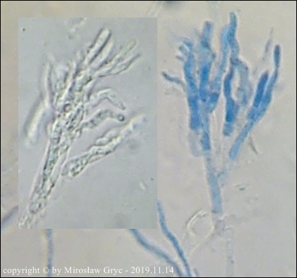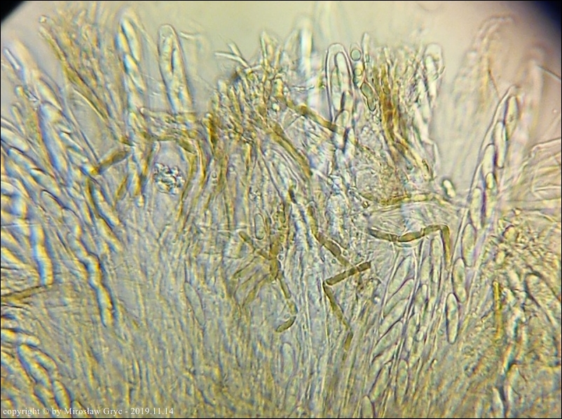 Owocniki masowo wyrastające na drobnych i grubszych gałązkach brzozy, zarówno leżących na powierzchni jak i zagrzebanych głębiej w ściółce. Zastanawiający jest fakt występowania w hymenium dojrzałych owocników elementów budowy podobnych do parafiz jednak silnie porozwidlanych. Nadmienić należy, że również w tych samych owocnikach występują parafizy typowe dla tego rodzaju.Również interesująca jest reakcja (porus reaction) na jod. Po zastosowaniu lugolu ujście zarodników przebarwia się na ciemnoniebiesko (praktycznie granat) a nie tak jak u innych gatunków z tego rodzaju, na niebiesko.