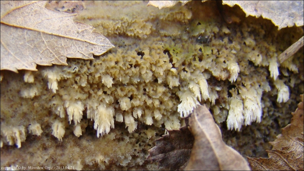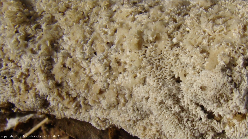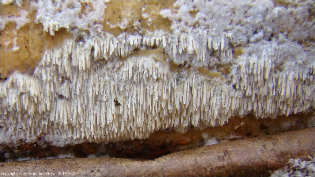 Substrat: Młody owocnik rozpostarty na dolnej stronie leżącego na ziemi pnia brzozy.