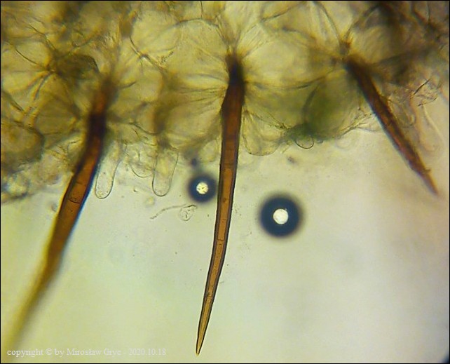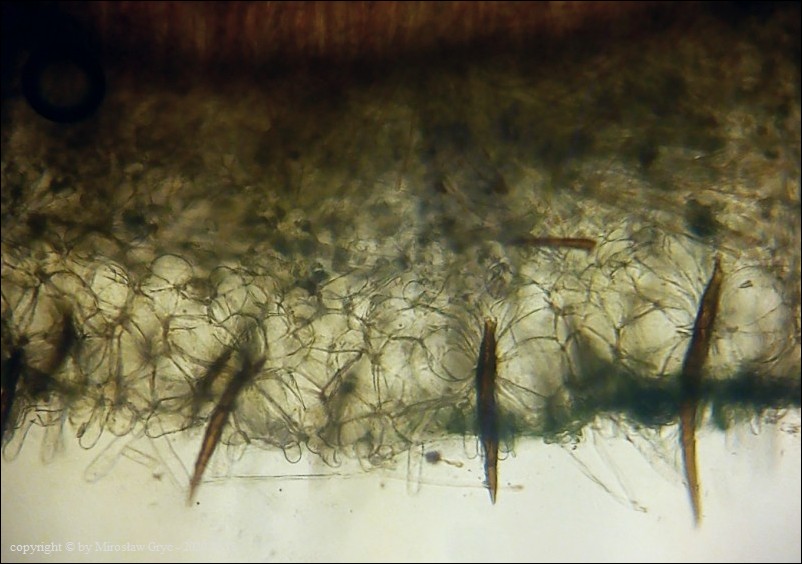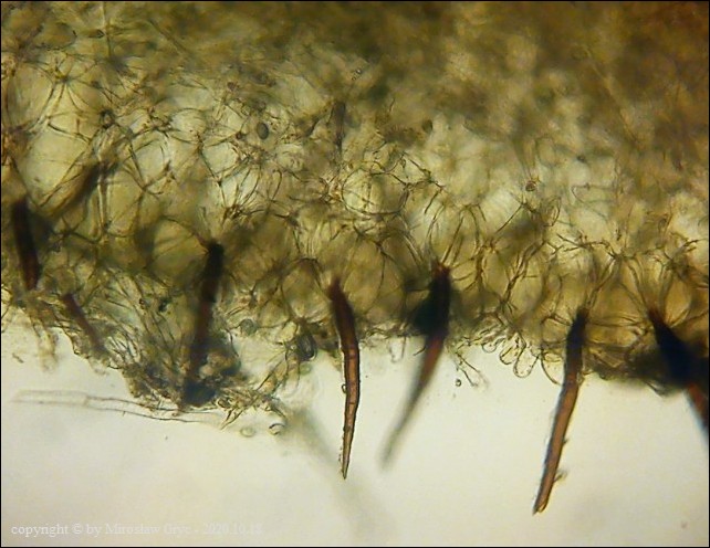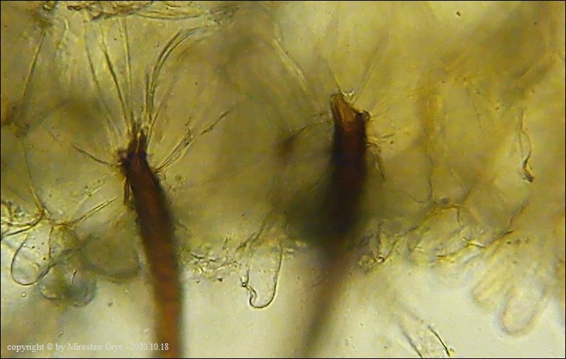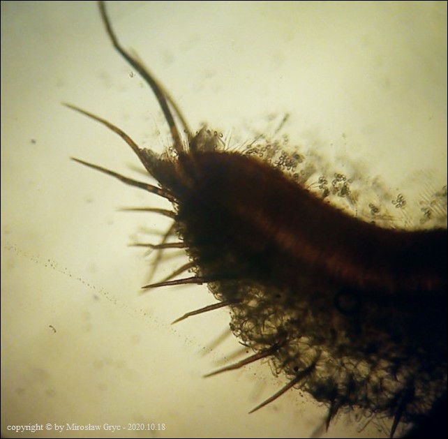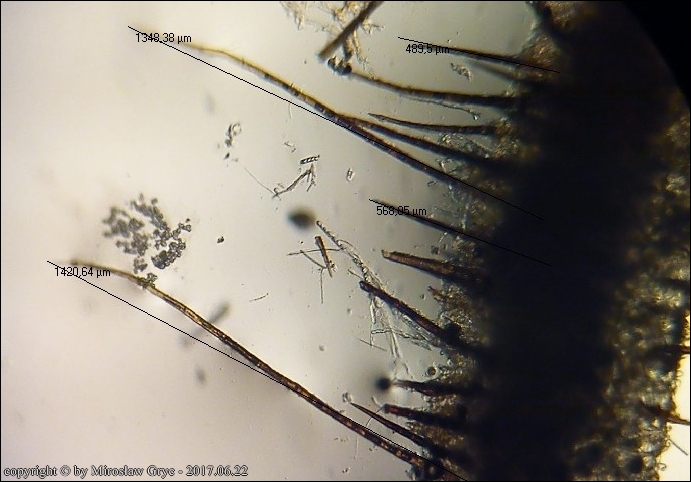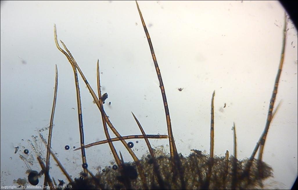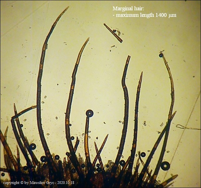 Scutellinia crinita jest jednym z bardziej pospolitych gatunków z tego rodzaju, występującym na terenie Puszczy Knyszyńskiej. Wyrasta zazwyczaj na szczątkach butwiejącego drewna.Charakteryzuje się długimi włosami wystepującymi na krawędzi oraz znacznie krótszymi na dolnej stronie owocnika. Podstawy włosów zazwyczaj występują w formie pojedynczej (simple) chociaż niewielka część włosów ma podstawy bardziej ukorzenione (bio; trio).