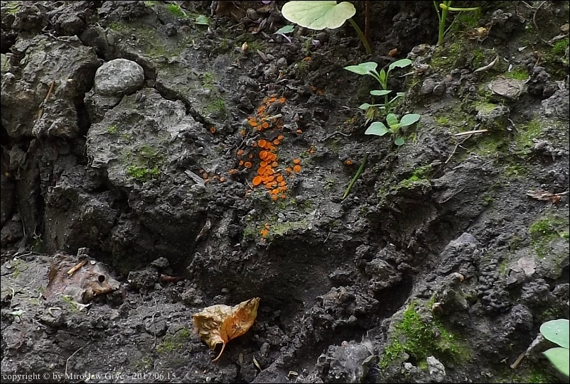 Substrat: Grupka owocników na błotnistej koleinie drogi leśnej.