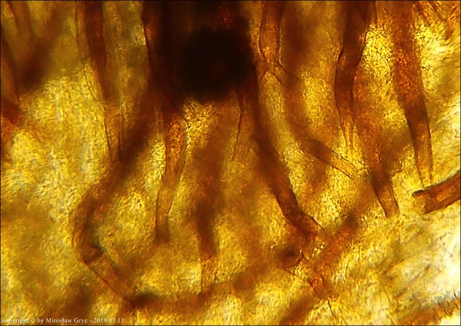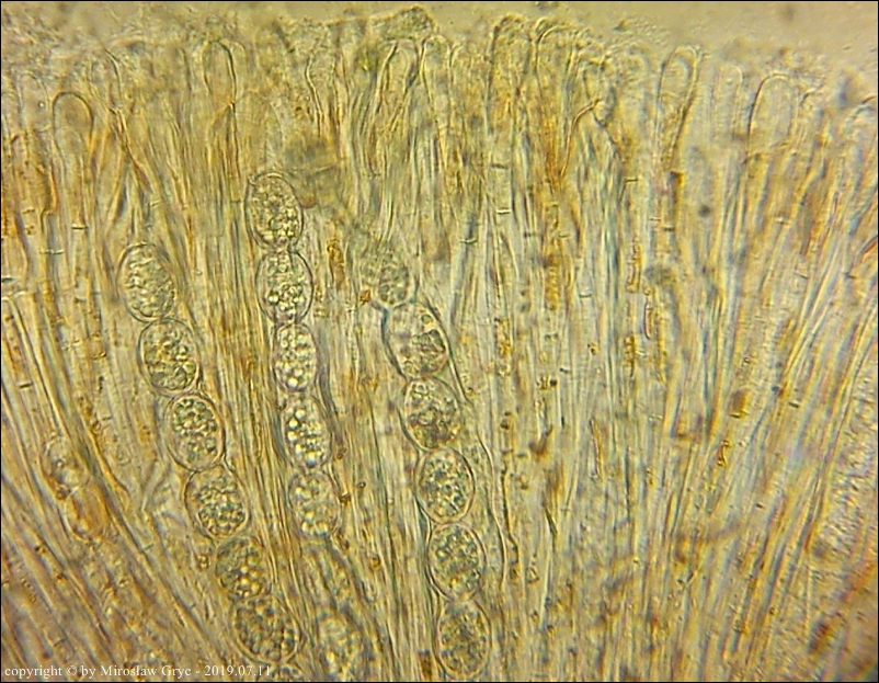 Parafizy - zazwyczaj niewyraźnie septowane, o górnej części poszerzonej (rozdętej), dość często rozwidlonej, wypełnionej złotobrązową treścią.