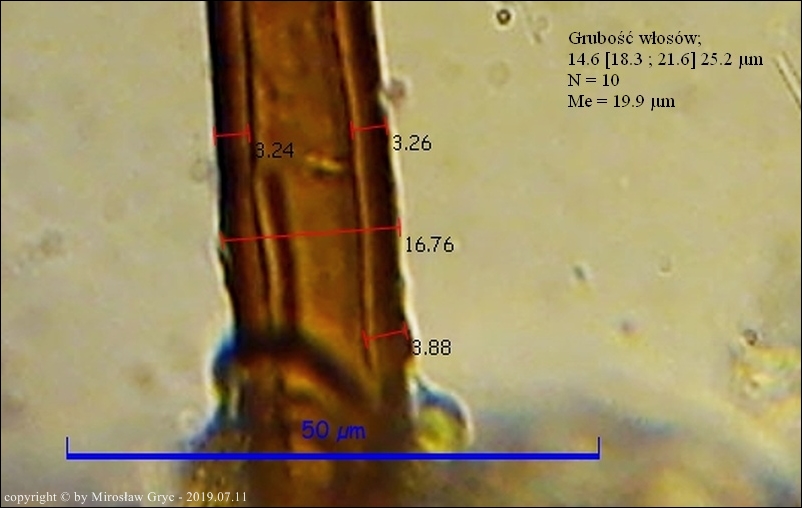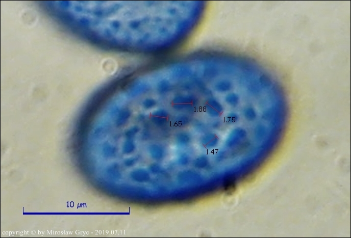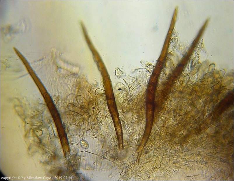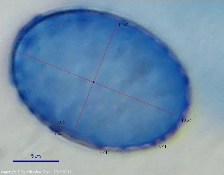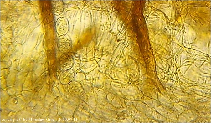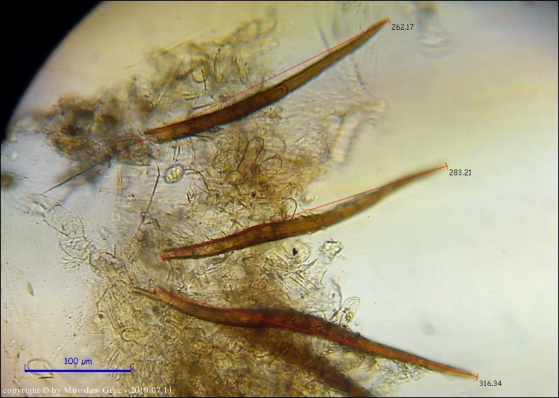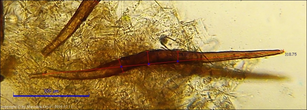 Zarodniki - elpsoidalne, 19.4-26.5 x 13.8-16.6 µm z drobna ornamentacją 0.8-1.3 µm szerokości, do 0.4 µm wysokości, nieregularną, miejscami połączoną.Włoski - dość krótkie 150-420 µm, zazwyczaj łukowato powyginane, z 3-4 septami, o grubości 12-20(-28) µm, zwężające się ku słabo ukorzenionej podstawie.