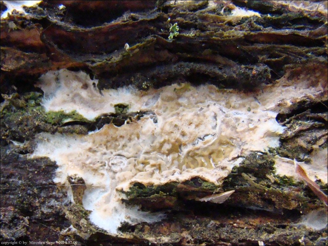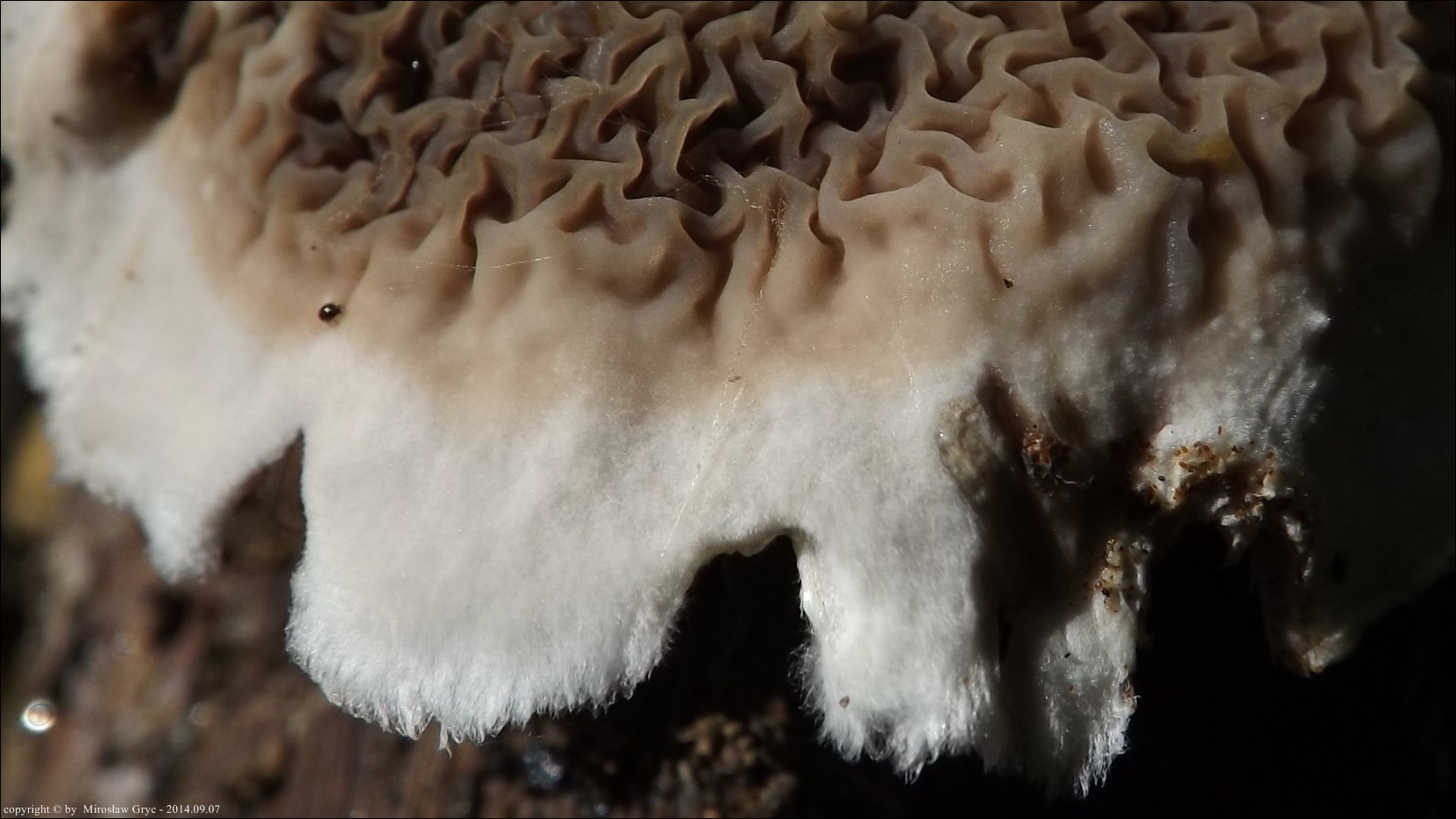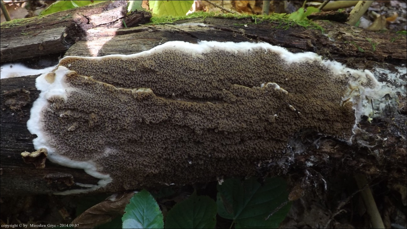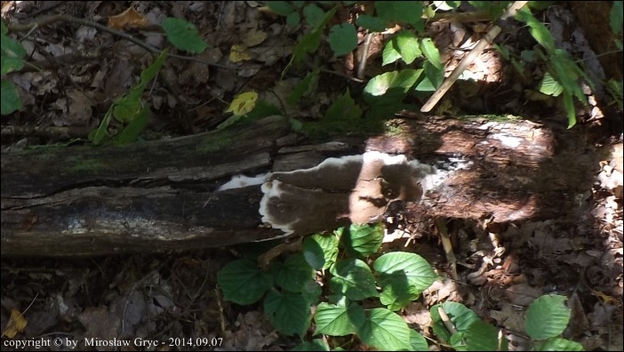 Substrat: Pokaźny owocnik na dolnej stronie leżącego na ziemi, fragmencie konaru liściastego (grab lub dąb).