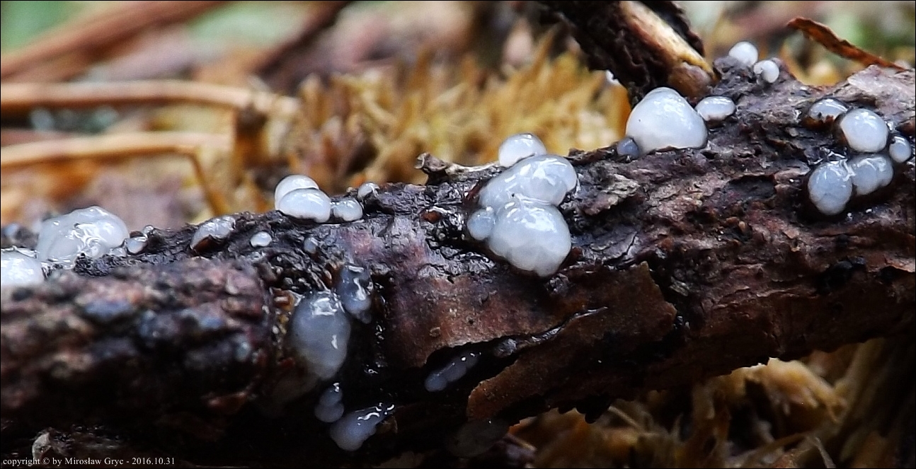 Substrat: Owocniki na gałęziach liścistego leżącego na kupie chrustu.