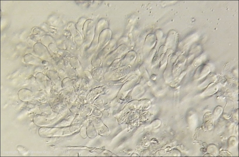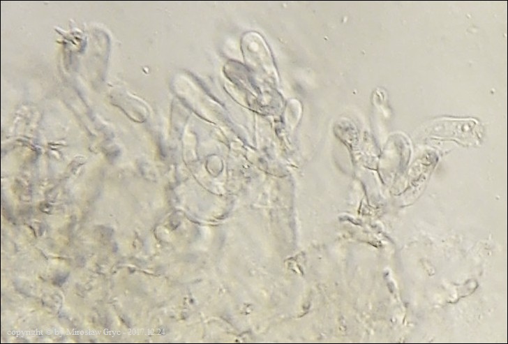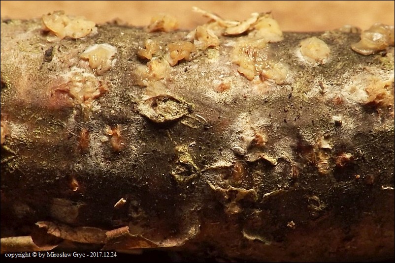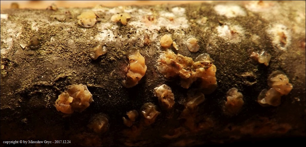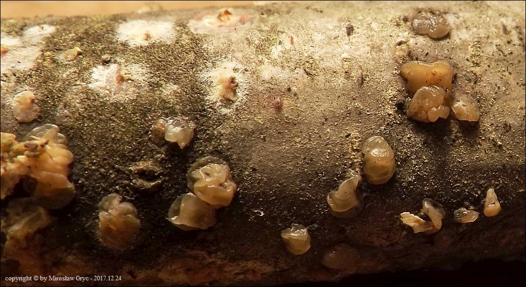 Martwa gałąź leszczyny oraz we łzawniku (Dacrymyces sp.) .