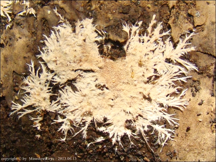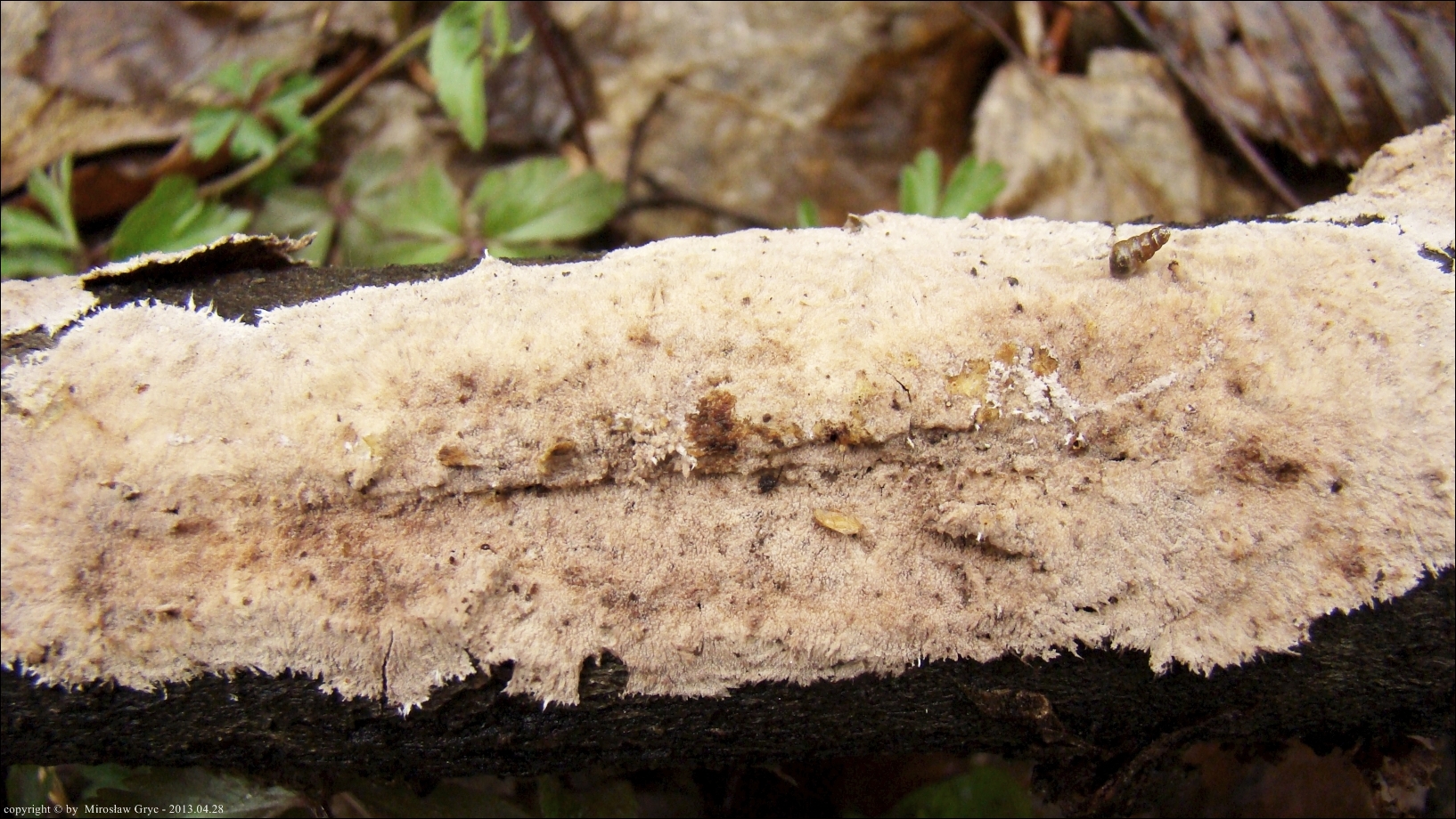 Substrat: Owocniki na dolnej stronie, leżącej na ziemi topolowej gałęzi.