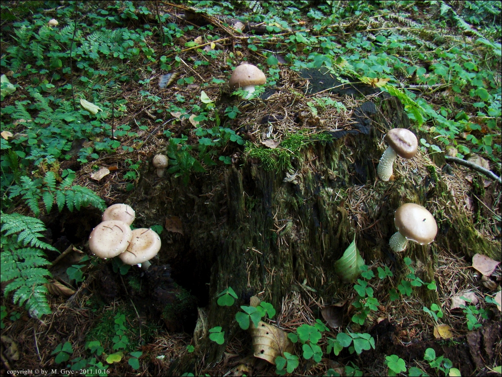 Substrat: Grzyby rosły na mocno zbutwiałym pniu, trudnym już do identyfikacji.