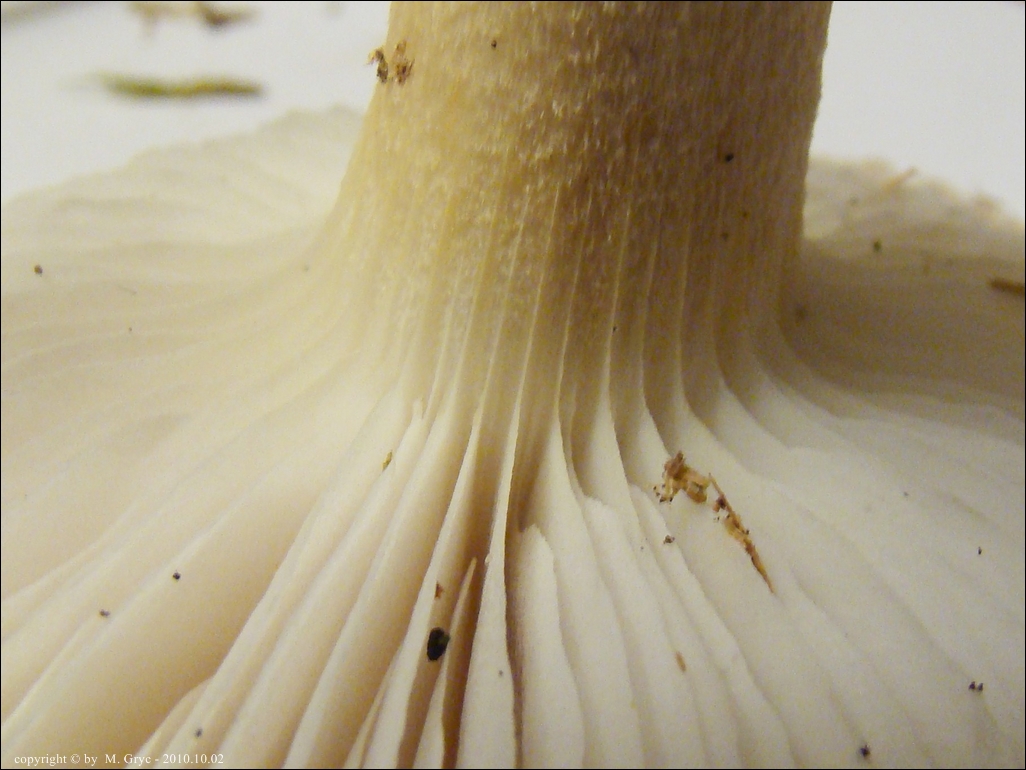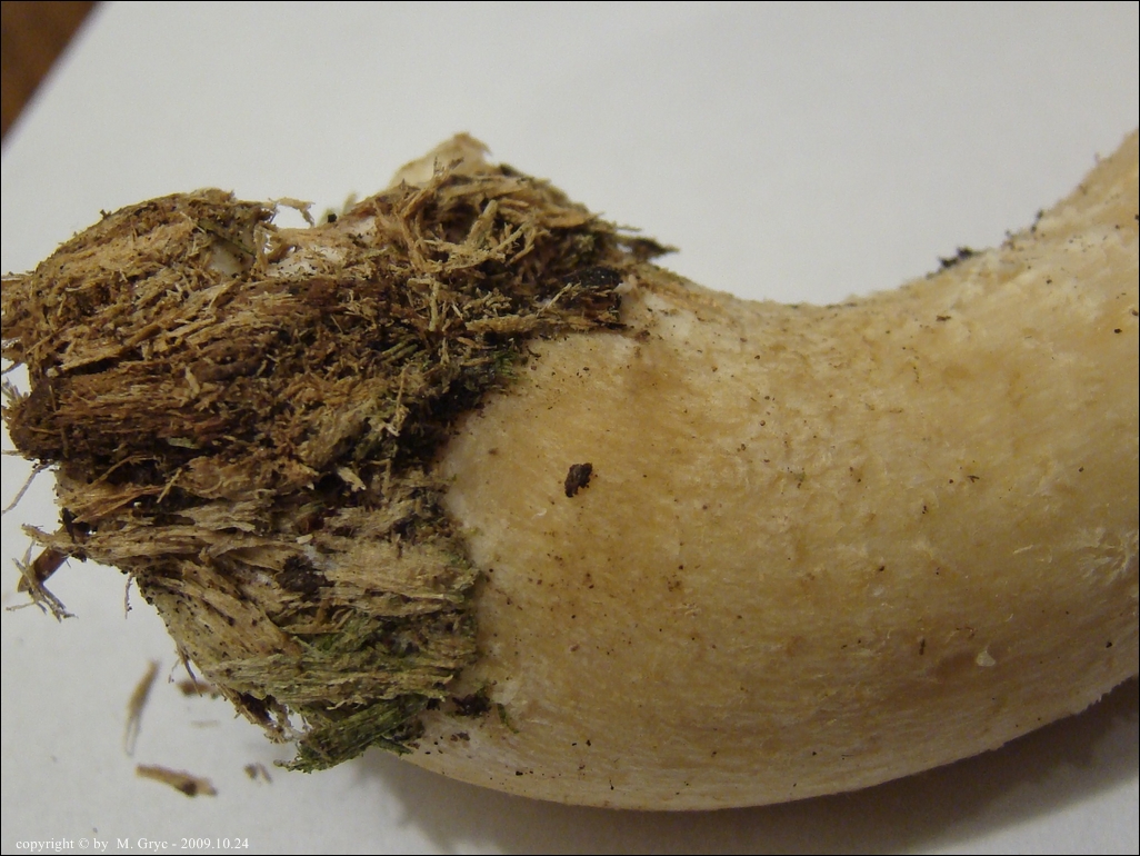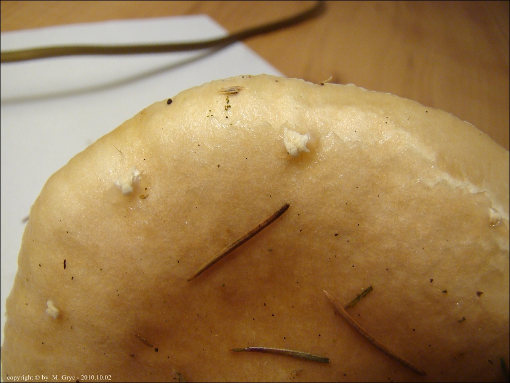 Substrat: Pojedynczy owocnik wyrastał właśnie w takim miejscu, dodatkowo jeszcze użyźnionym przez liczne, częściowo zbutwiałe gałązki świerka zagrzebane w igliwiu. Gatunek określony mikroskopowo przez Błażeja Gierczyka.