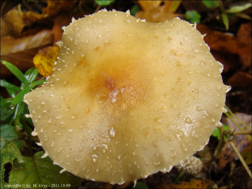 średnicy 2-5 cm, pólkolisto sklepiony; powierzchnia barwy ochrowobrunatnej, pokryta przylegajacymi jaśniejszymi łuseczkami (początkowo prawie białymi z wiekiem brunatniejącymi), w czasie wilgotnej pogody śliska, prawie śluzowata, lub sucha w okresach mniejszej wilgotności.