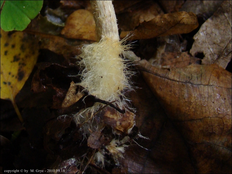 Wyrasta na zbutwiałych szczątkach drewna zagrzebanych w ziemi lub w ściółce.