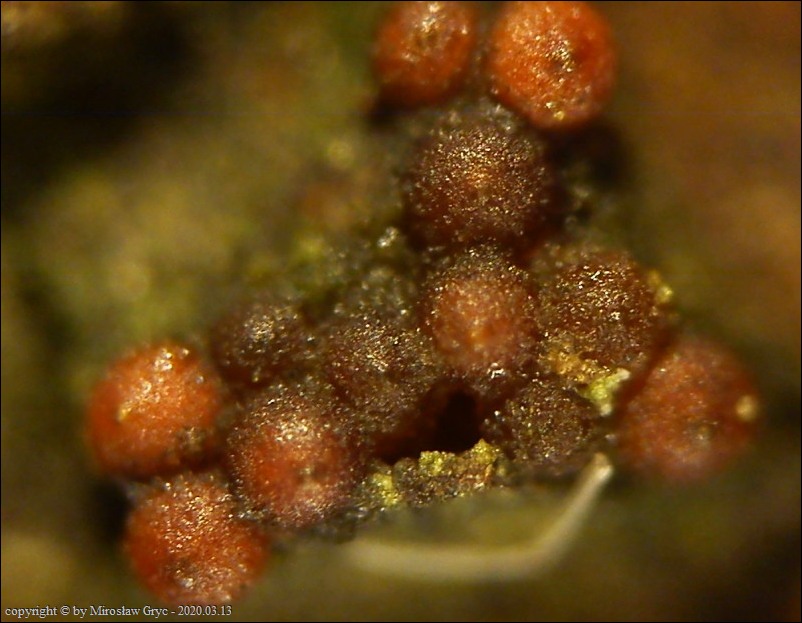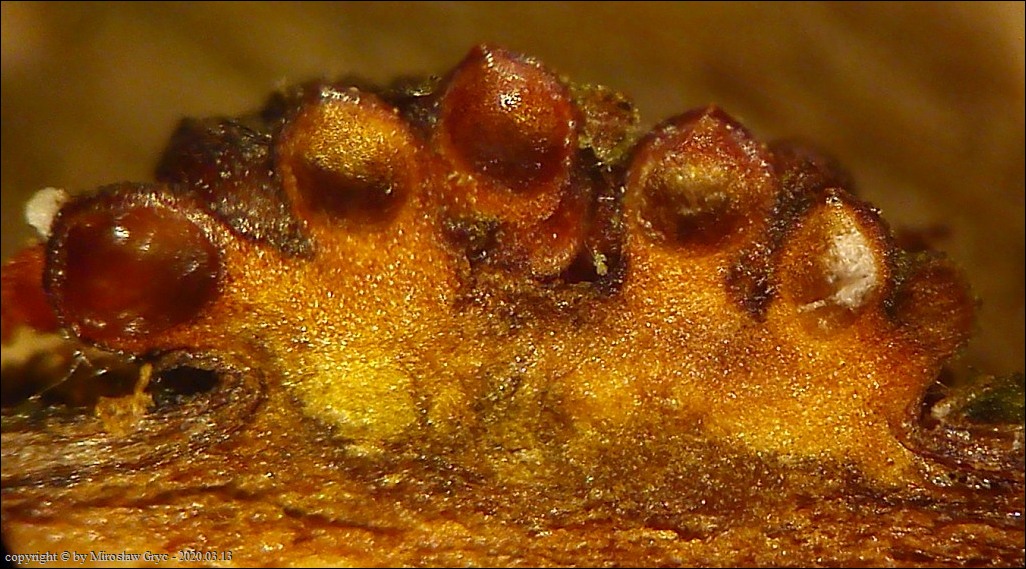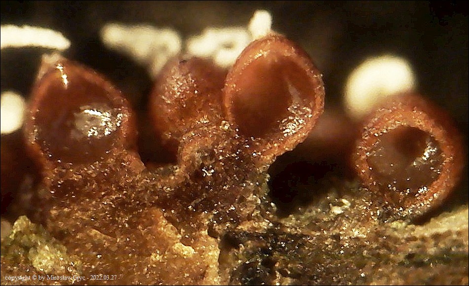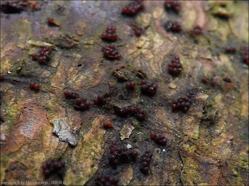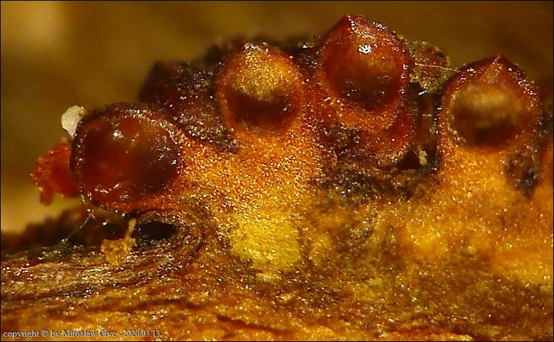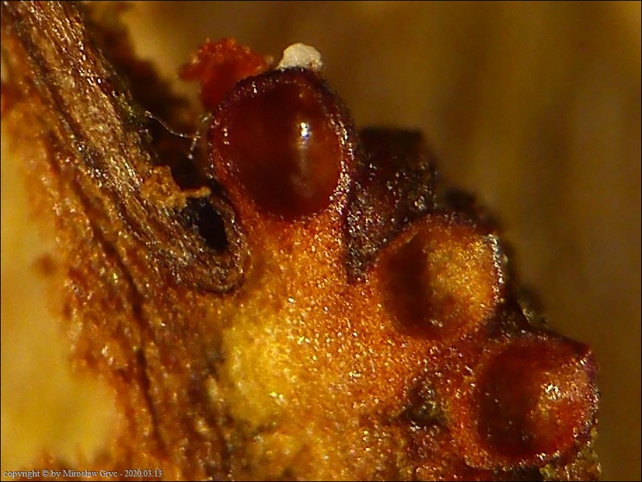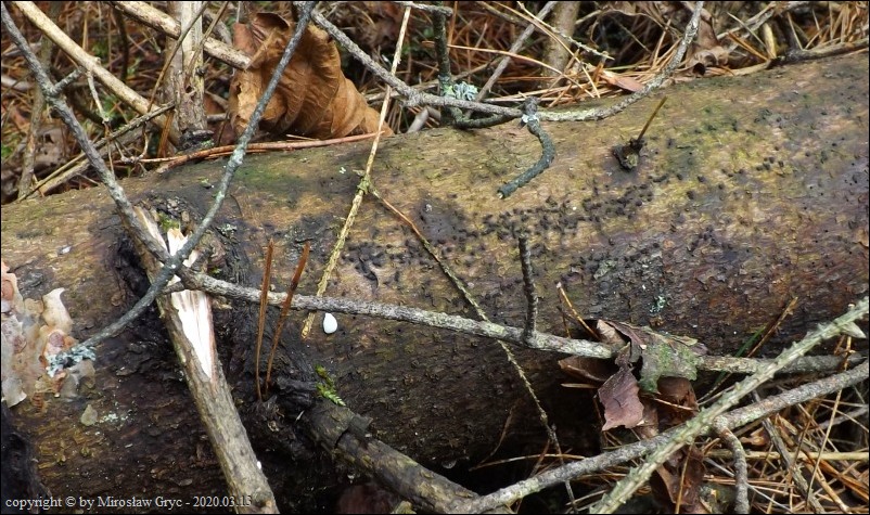 Substrat: Owocniki masowo, na pniu złamanego świerka (Picea abies) .