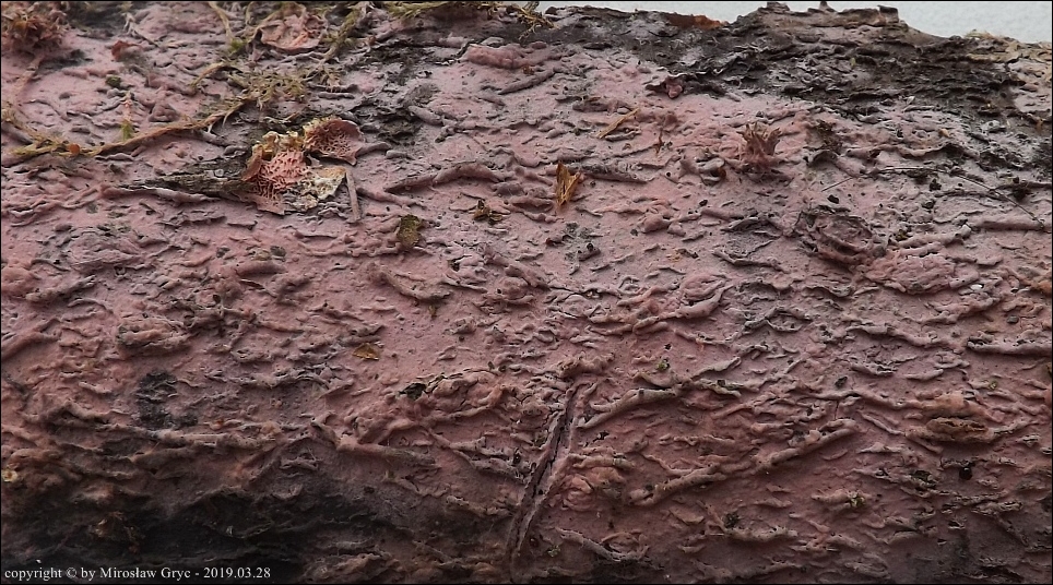 Substrat: Owocnik rozpostarty na martwym, leżącym konarze czeremchy.