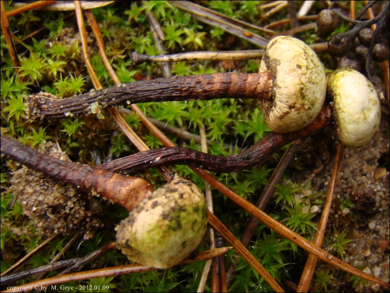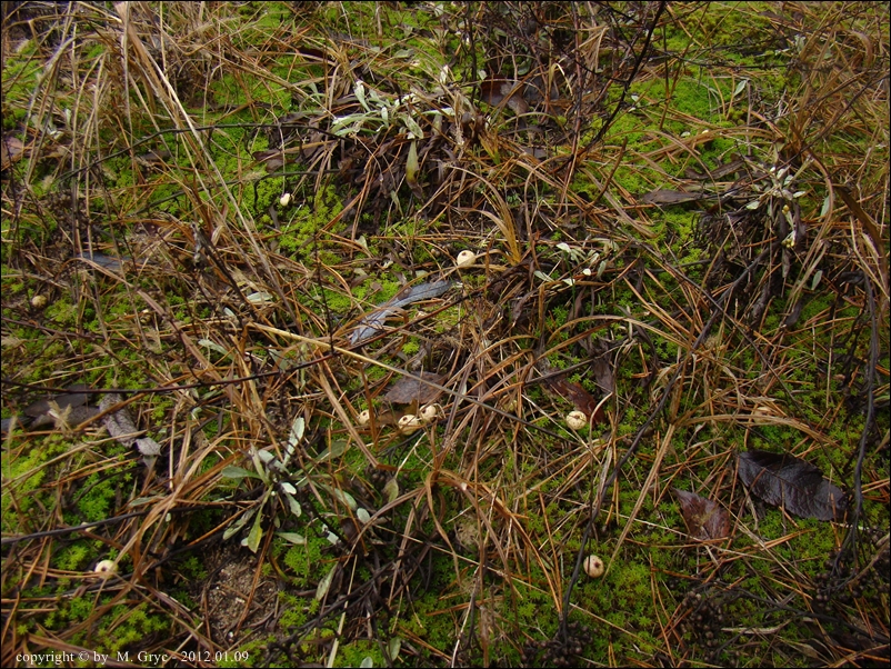 Lokalizacja: Wyrobisko pożwirowe w okolicy Ogrodniczek, żwirowe podłoże porośnięte mchem, kilkadziesiąt owocników w jednej grupie.