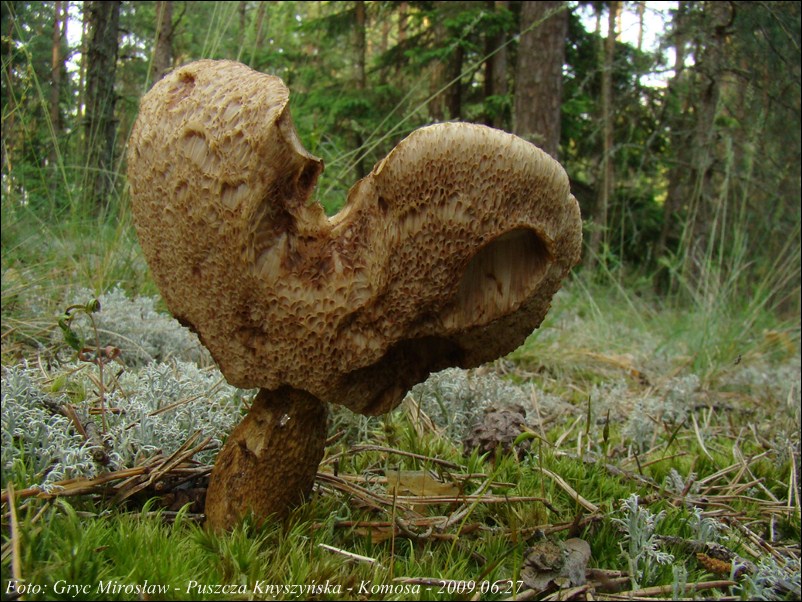 poduszkowaty, barwy jasnobrązowej, z wiekiem płowiejącej i nabierajacej odcieni szarości; powierzchnia matowa, łudząco przypominająca zamsz; skórka często spękana, lekko śliska tylko w czasie wilgotnej pogody Hymenofor:rurkowaty; pory za młodu białe, następnie różowawe, z wiekiem coraz bardziej szare, po uciśnięciu ciemnieją.
