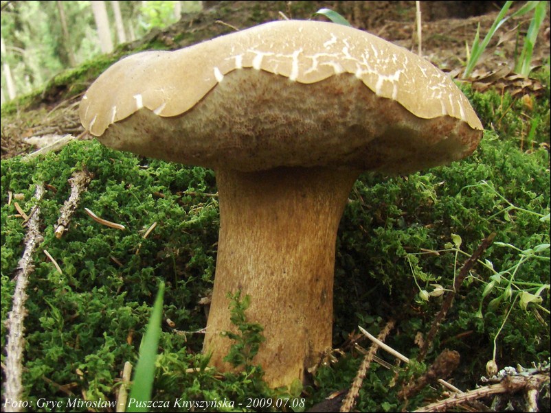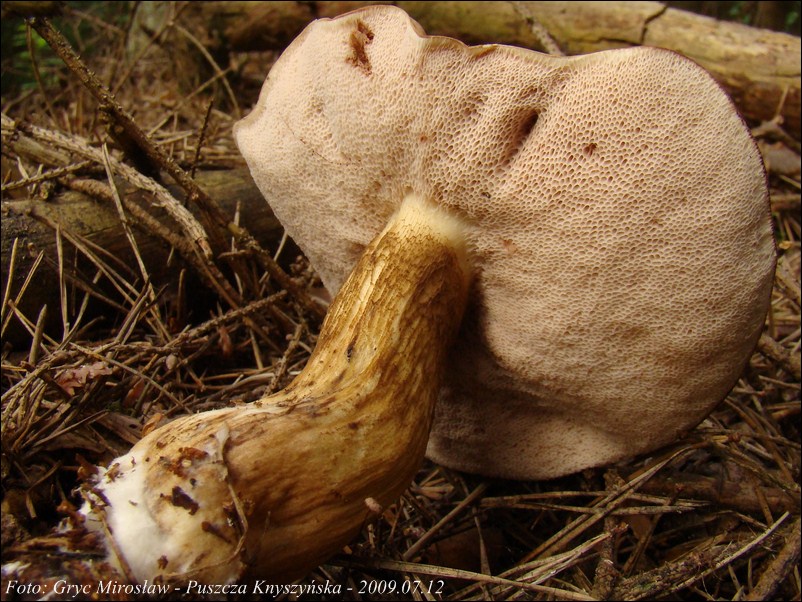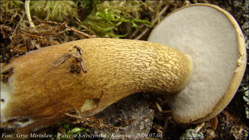 Trzon: od kształtu maczugowego do równego na całej długości, przeważnie jednak u podstawy szerszy niż przy kapeluszu; powierzchnia z wyraźną brązową siateczką, praktycznie na całej długości, zazwyczaj wyraźniejszą tuż pod kapeluszem i zanikającą u podstawy (patrz uwagi w opisie wyżej).