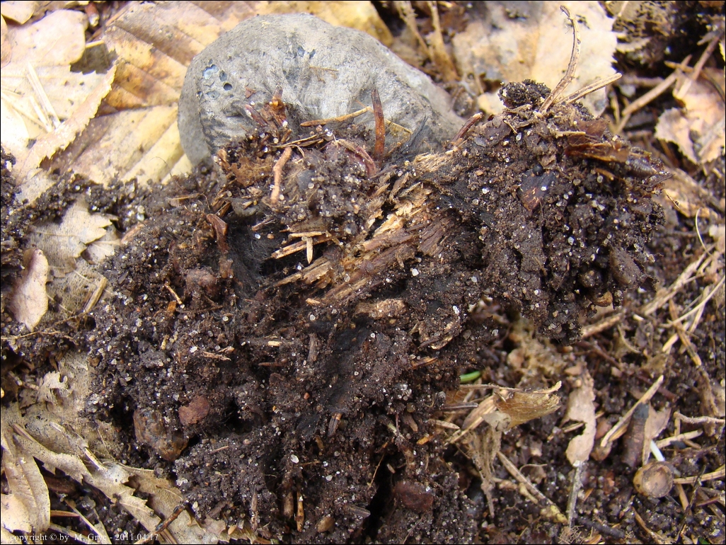 Substrat: Trafiłem na kolejne, piękne stanowisko tego grzybka. Nie zadawałem nawet sobie trudu żeby policzyć owocniki dokładnie, ale na pewno coś w przedziale od 30 do 40 sztuk. Rozsiane w okręgu o średnicy około 50 m, w kawałku lasu grabowego z małą domieszką dębu. Również miejsce gdzie występuje czarka austriacka. Większość owocników zdecydowanie wyrastała na gałęziach o grubości od 2 do 6 cm. Zdarzały się jednak i owocniki sprawiające wrażenie jakby rosnące bezpośrednio na ziemi. Tym razem również sprawdziłem dokładnie podłoże jednego z takich owocników. Znajdowały się w nim częściowo zbutwiałe małe fragmenty gałązek (śr. ok. 0.5cm). Grzybnia tworzyła bardzo bogaty splot w wierzchniej warstwie próchnicy. Poniżej przedstawiam to na zdjęciach.
