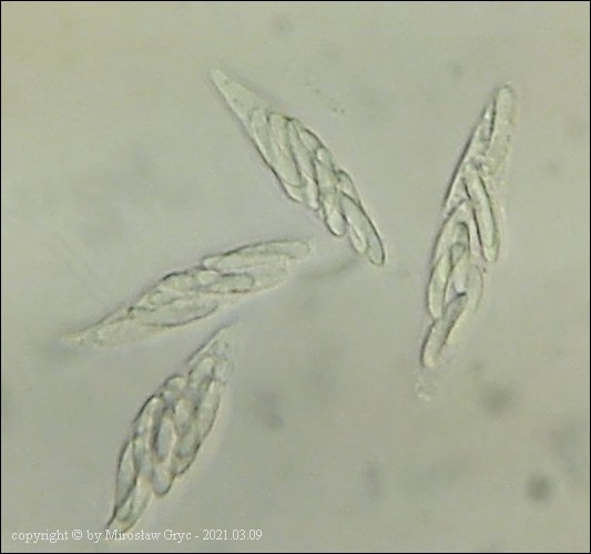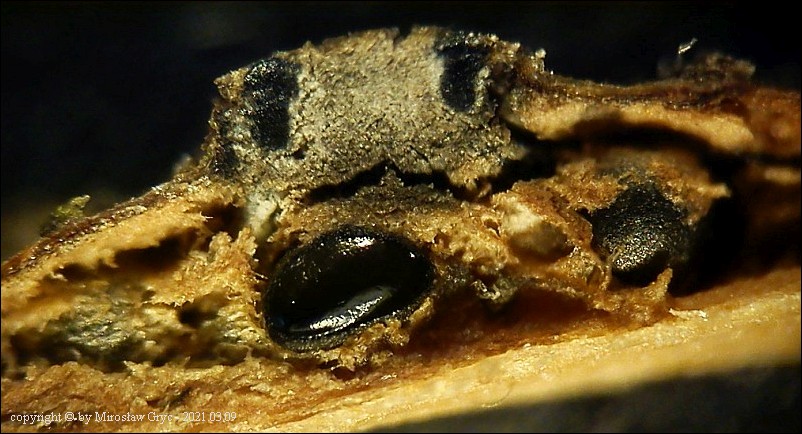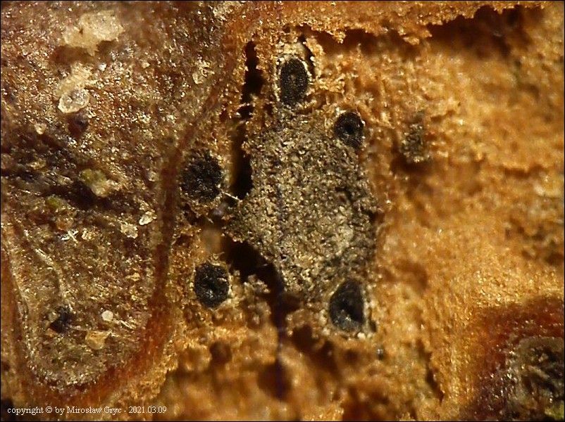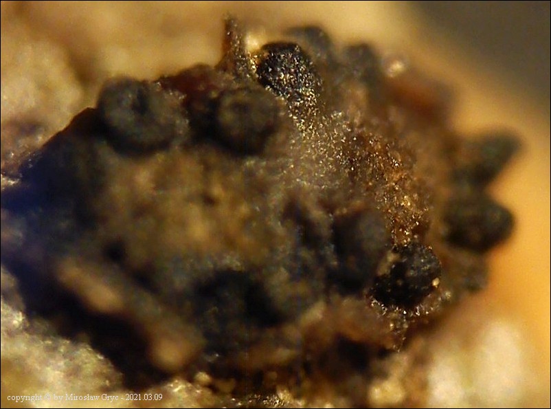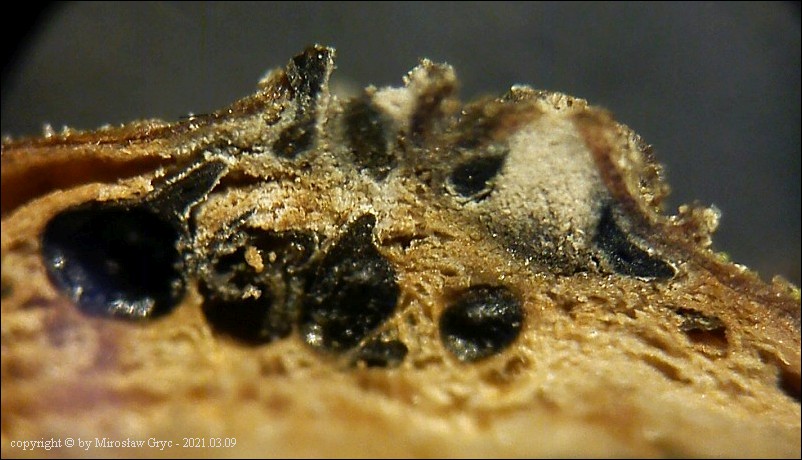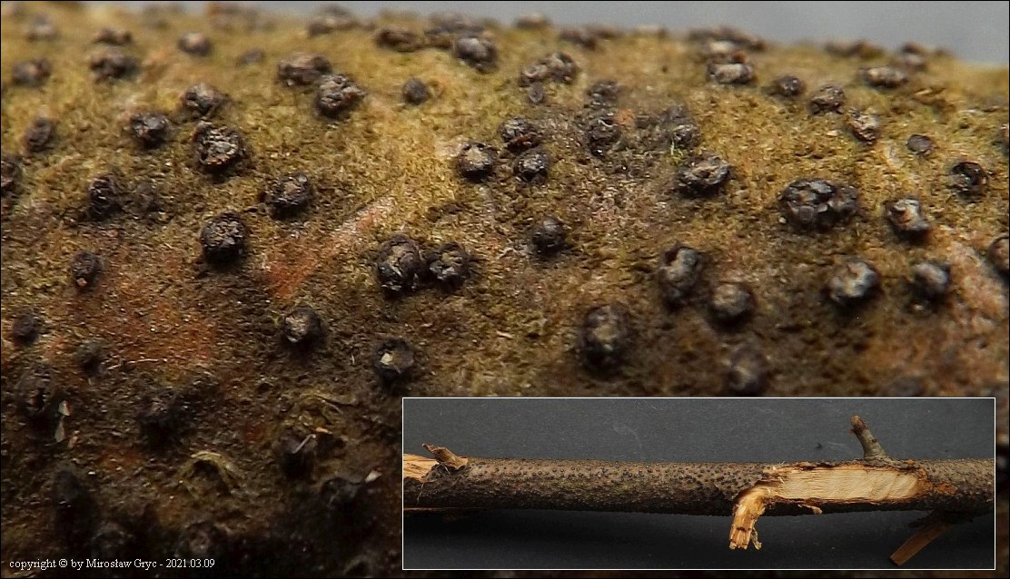 Substrat: Owocniki na martwych gałęziach dziko rosnącej jabłoni, na skraju lasu. Gatunek określiła na podstawie zdjęć Vera Hayova. Dziękuję!