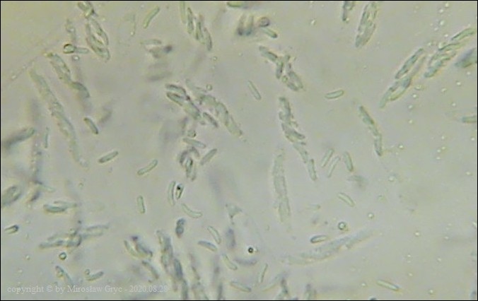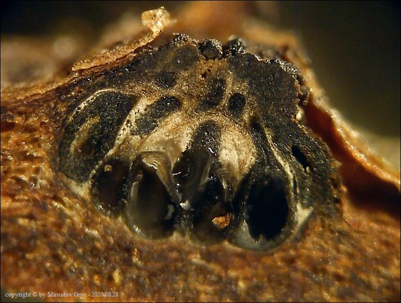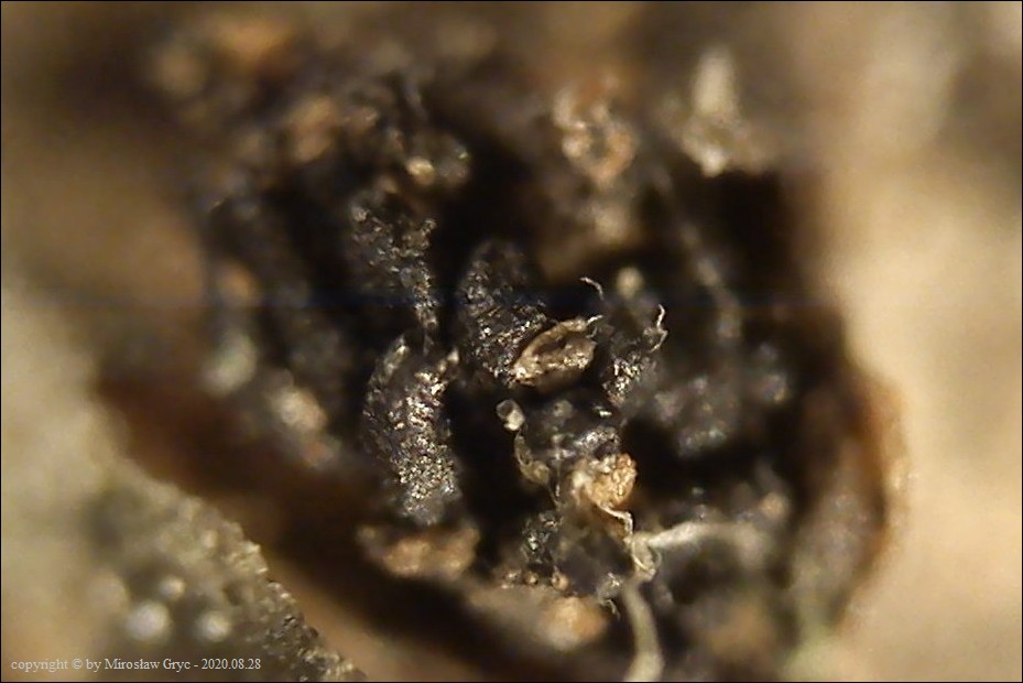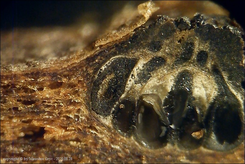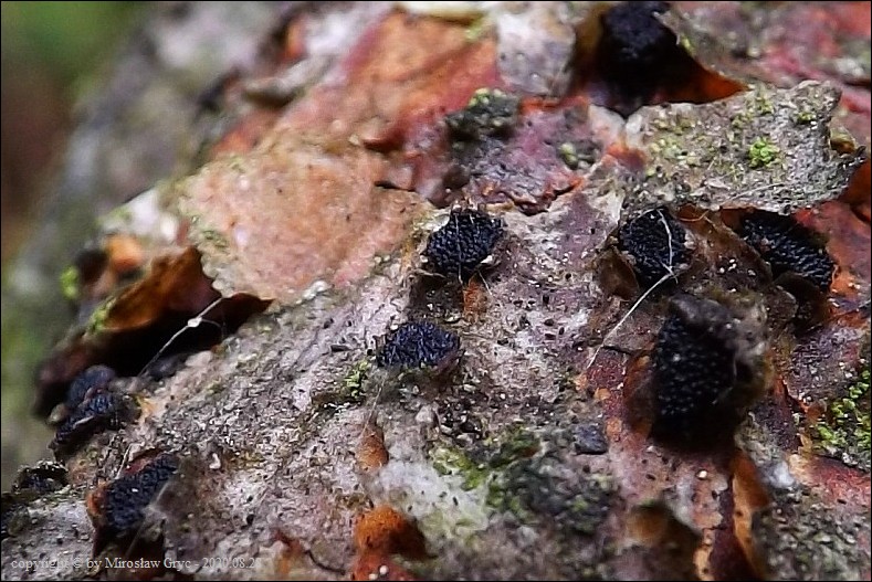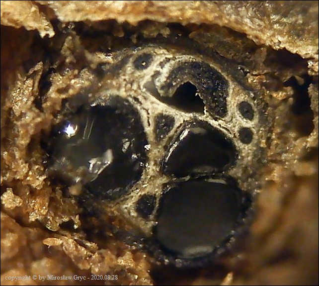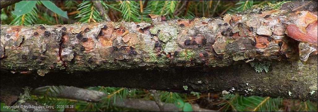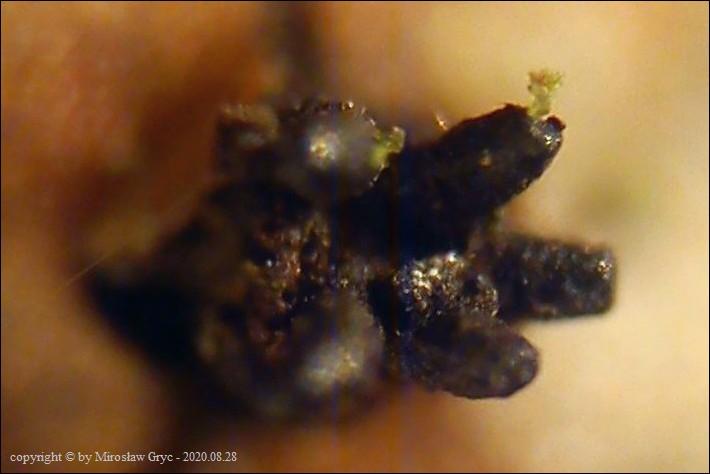 Substrat: Owocniki na leżącej na ziemi gałęzi sosny pospolitej (Pinus sylvestris) .