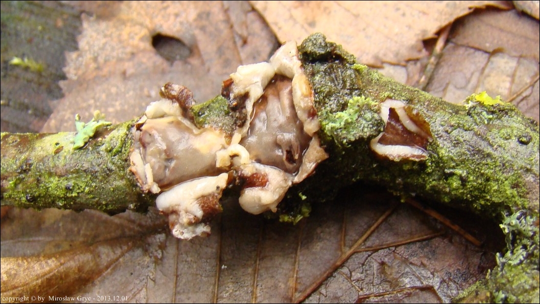 Substrat: Fragment lasu w średnim wieku, o zadrzewieniu mieszanym (świerk, brzoza, osika, inne liściaste sporadycznie). Owocnik wyrastał na leżącej na ziemi gałązce liściastego (około 1-1,5 cm średnicy), prawdopodobnie brzozowej.